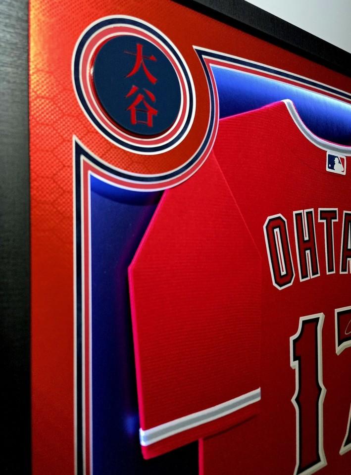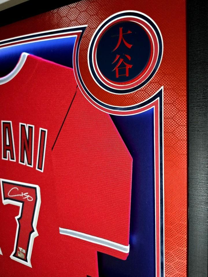 Custom frame measures 33" x 42" in size and comes installed with customizable LED backlighting. The frame features a Nike jersey jersey that has been hand-signed by Shohei Ohtani (Los Angeles Angels). This is a One of One frame design. It has been deleted and will not be used again.