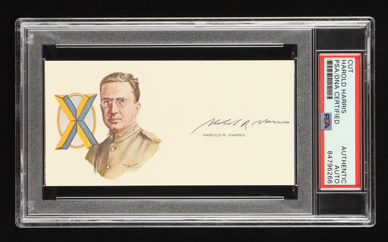 "Presented is a rare hand-signed cut signature of Brigadier General Harold R. Harris (1895–1988), executed in pencil. This autograph originates from a limited edition Gathering of Eagles lithograph and has been preserved as a stand-alone collectible. It is authenticated and encapsulated by PSA/DNA, providing both assurance of authenticity and long-term preservation.