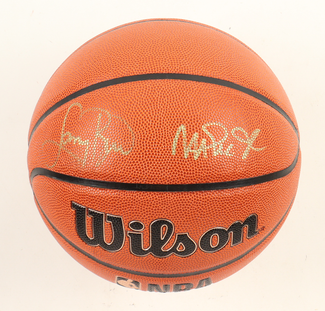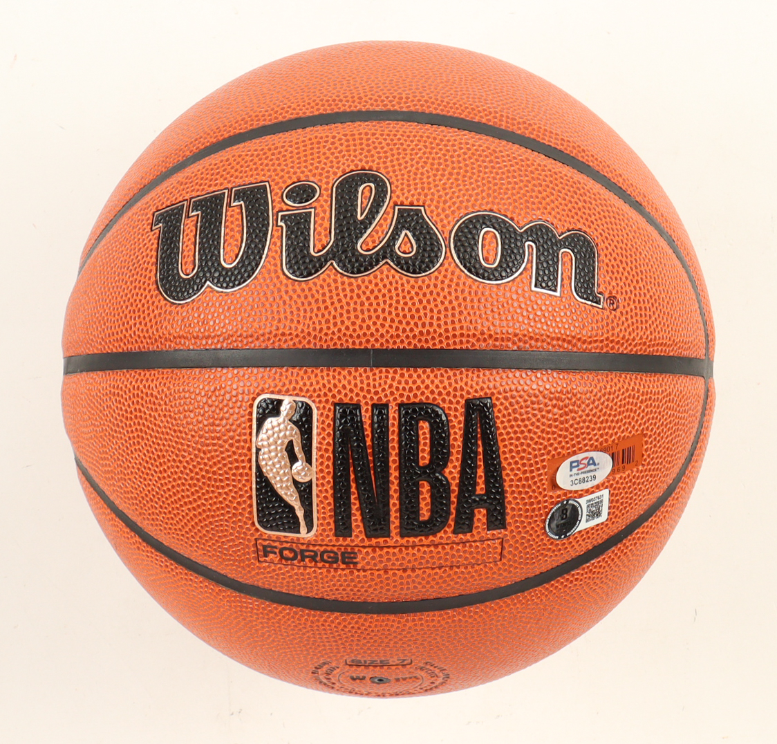 Wilson NBA Forge basketball With Display Stand has been hand-signed by Larry Bird (Boston Celtics, HOF) & Magic Johnson (Los Angeles Lakers, HOF).