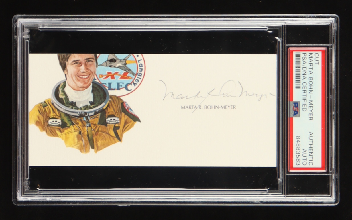 Presented is an exceptional and historically significant **hand-signed cut signature** by **Marta Bohn-Meyer**, renowned NASA engineer, test pilot, and the first woman to fly in the back seat of the **legendary SR-71 Blackbird**. Executed in **pencil**, this signature has been **encapsulated and authenticated by PSA/DNA**, one of the most trusted names in autograph authentication, ensuring its legitimacy and long-term preservation.