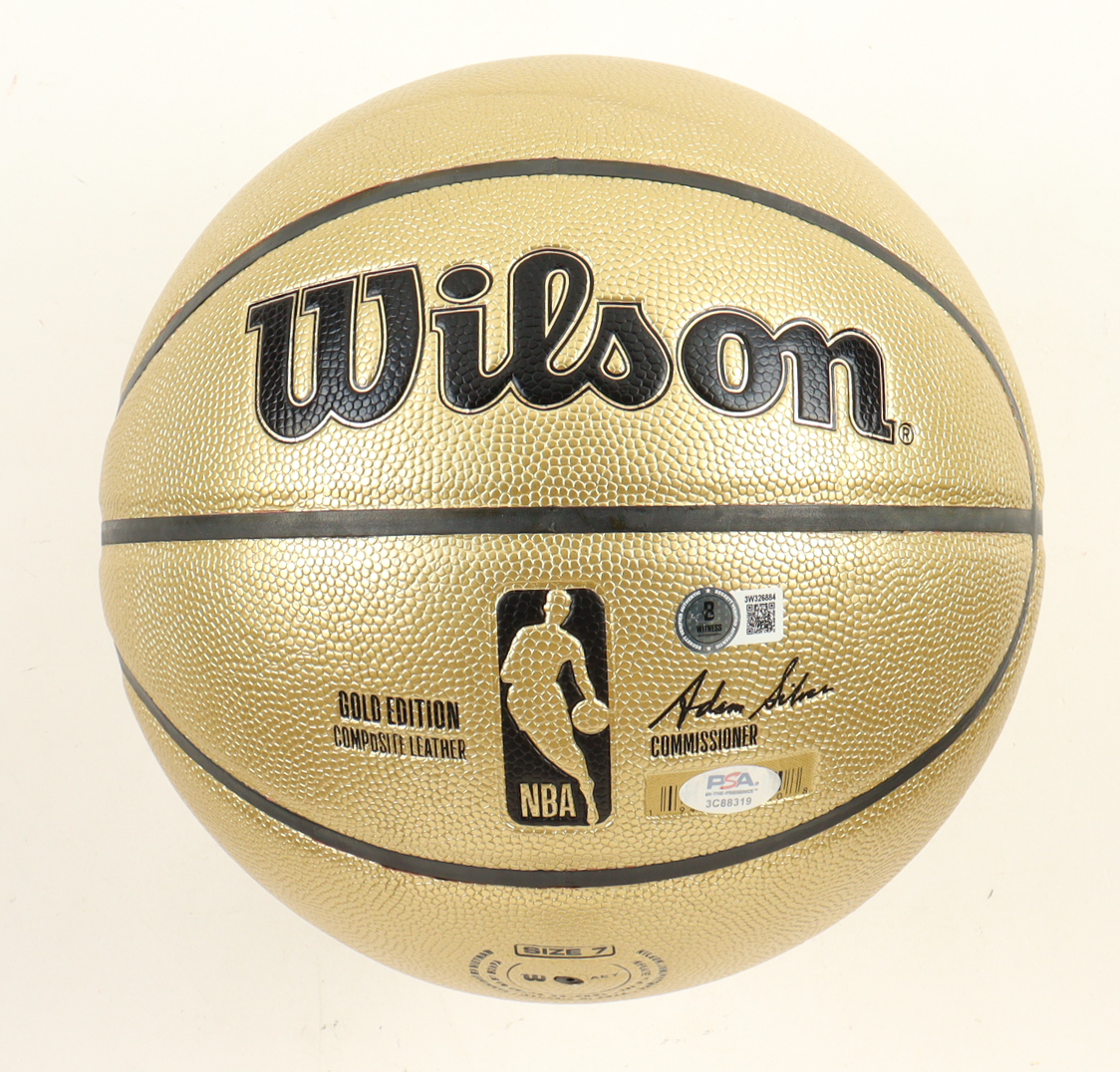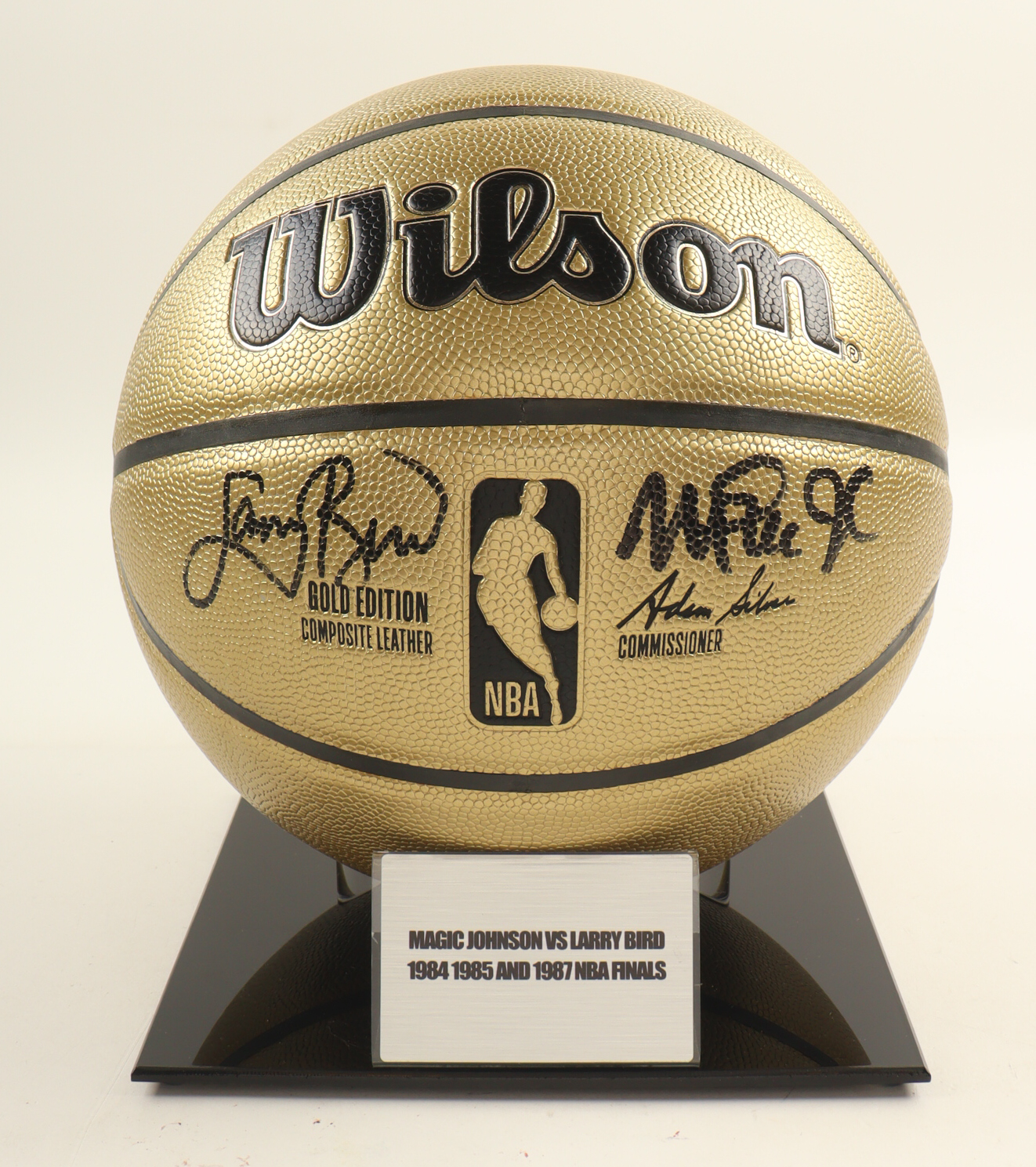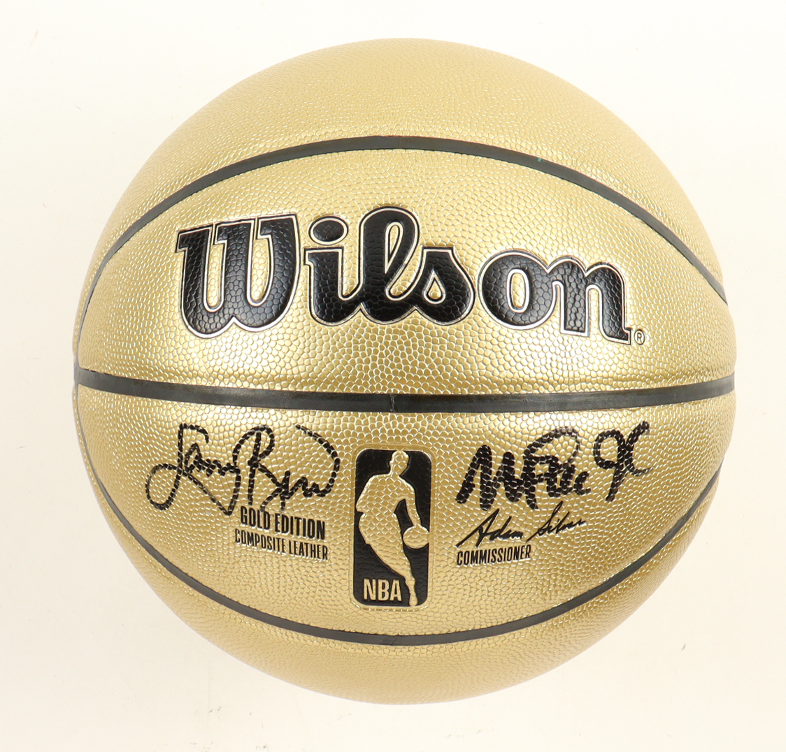 Wilson Gold Edition basketball With Display Stand has been hand-signed by Larry Bird (Boston Celtics, HOF) & Magic Johnson (Los Angeles Lakers, HOF).