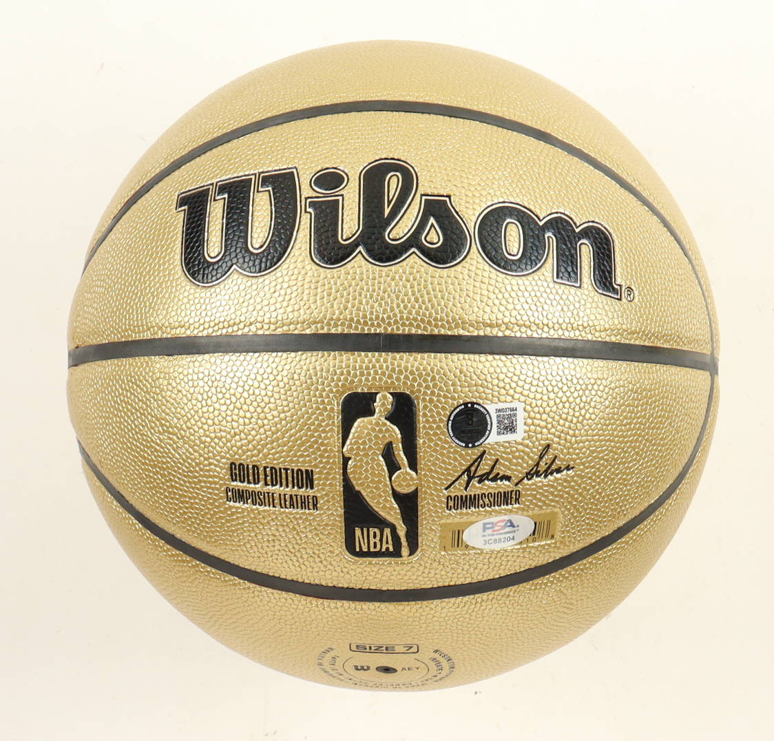 Wilson Gold Edition basketball With Display Stand has been hand-signed by Larry Bird (Boston Celtics, HOF) & Magic Johnson (Los Angeles Lakers, HOF).
