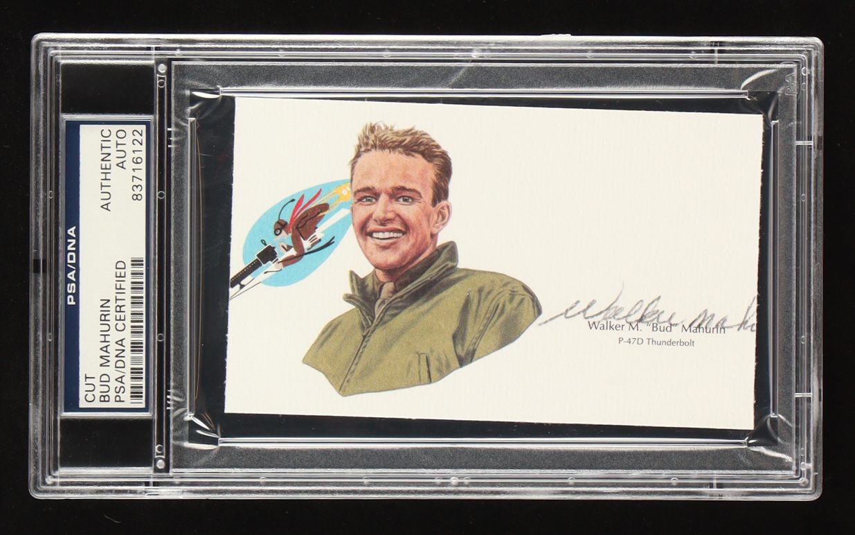 Presented is a rare and distinguished **hand-signed cut signature** of **Colonel Walker ""Bud"" Mahurin**, one of the most celebrated American Fighter Aces of World War II. Executed in **pencil**, this historically significant autograph is **encapsulated by PSA/DNA**, ensuring its authenticity and preservation for generations to come.