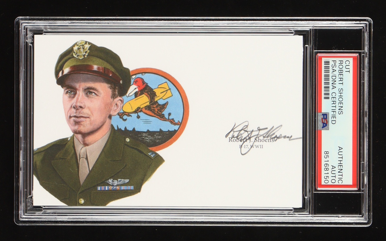 Prepare for a journey through the skies of WWII with this exclusive offering: a signed cut signature of 8th Air Force pilot Robert Shoens, authenticated and encapsulated by PSA/DNA.