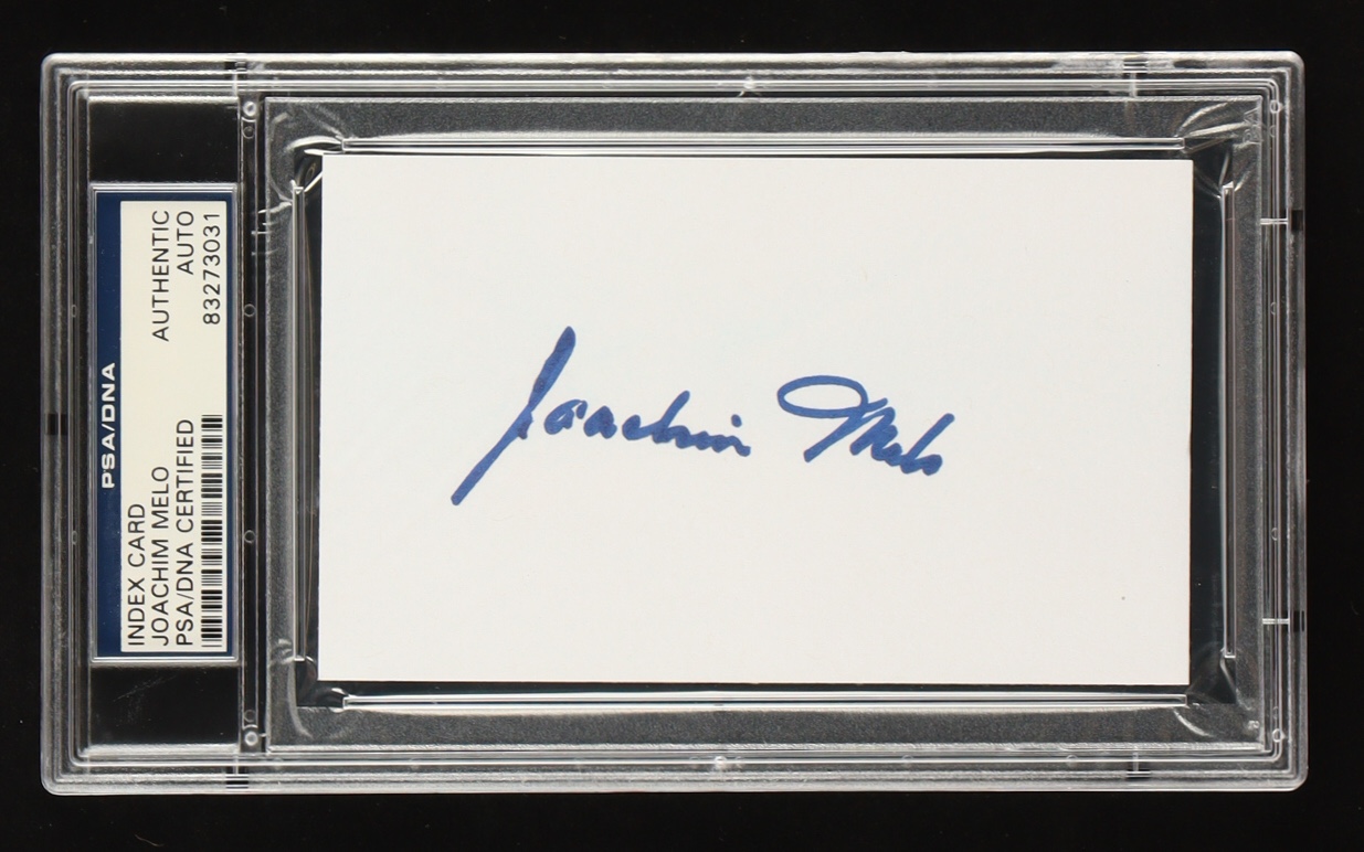 "Presented is a hand-signed 3x5 index card by Private First Class Joachim “Jo” Melo (1923–2011), signed in permanent ink. The autograph has been authenticated and encapsulated by PSA/DNA, ensuring both authenticity and long-term preservation.