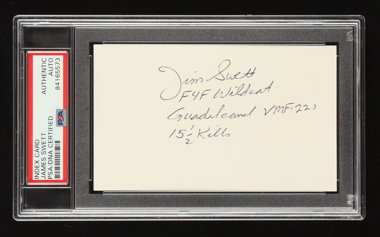 "Offered is a hand-signed 3x5 index card by Medal of Honor Recipient Major James E. Swett (1920–2009), signed in permanent ink. The autograph has been authenticated and encapsulated by PSA/DNA, ensuring both authenticity and long-term preservation.