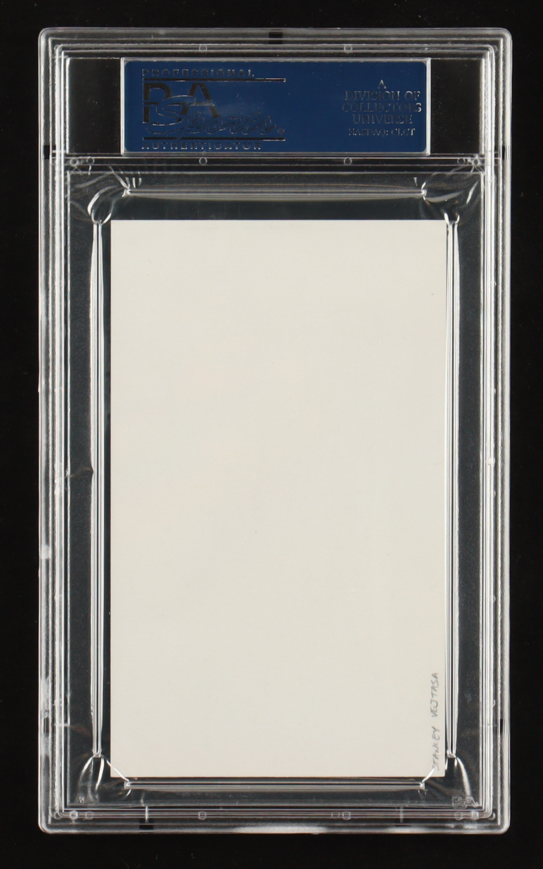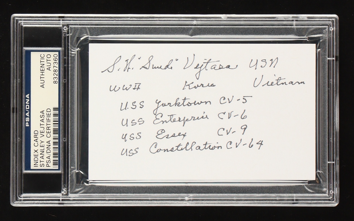 "Presented is a hand-signed 3x5 index card by Commander Stanley “Swede” Vejtasa (1914–2013), signed in permanent ink. The autograph has been authenticated and encapsulated by PSA/DNA, ensuring both authenticity and long-term preservation.