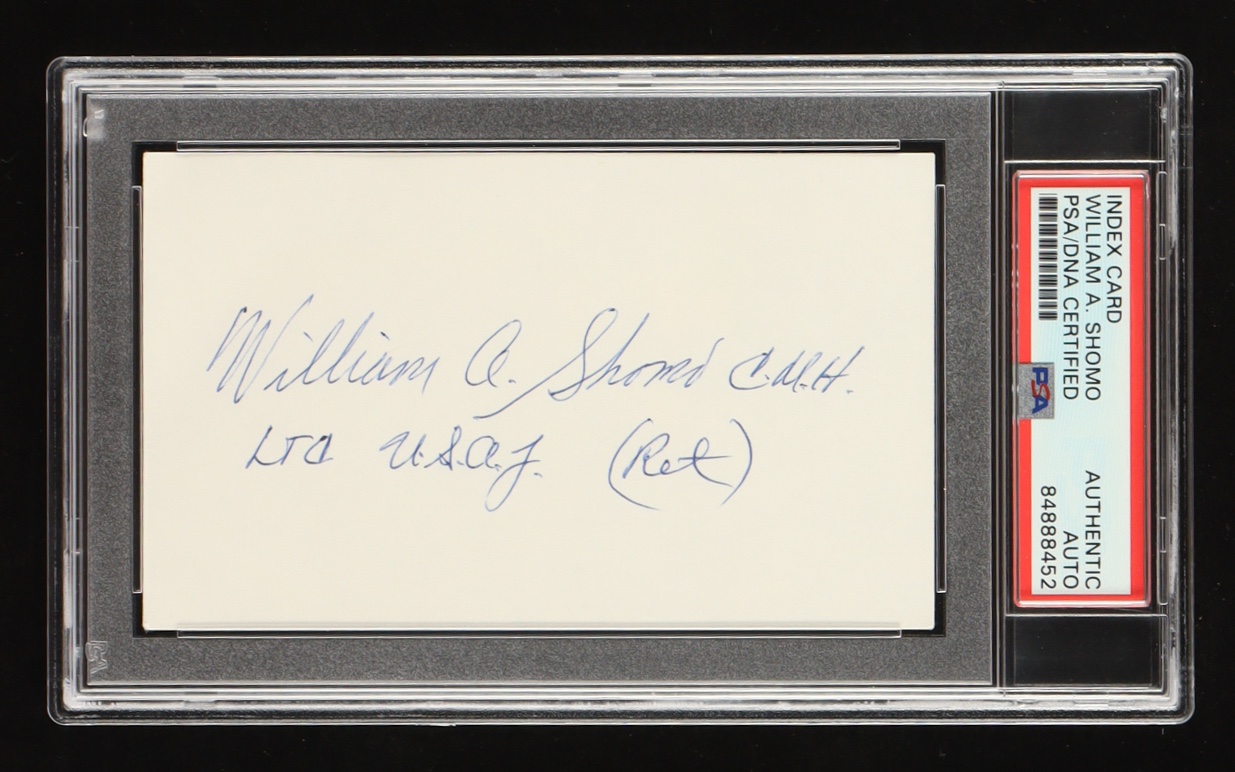 "Offered is a hand-signed 3x5 index card by Lieutenant Colonel William A. Shomo (1918–1990), signed in permanent ink. The autograph has been authenticated and encapsulated by PSA/DNA, ensuring both authenticity and long-term preservation.