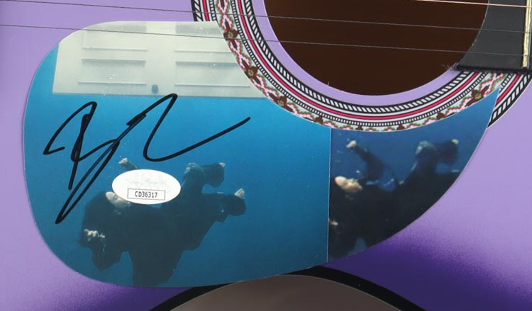 Acoustic guitar measures approximately 38" in length and has been hand-signed on a cut that has been repurposed as the pick-guard by Billie Eilish.