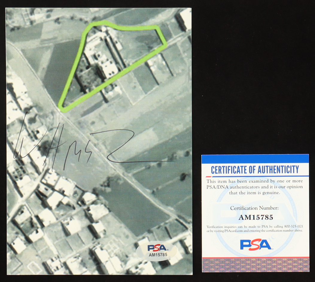""" Relive the historic moment of the Bin Laden raid with this extraordinary auction offering! Up for bidding is a signed aerial photograph of the Bin Laden raid, autographed by Admiral William McRaven, the mastermind behind the daring operation. Authenticated by PSA/DNA authentication services, this remarkable piece of military memorabilia captures a pivotal moment in modern history.