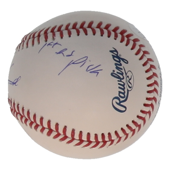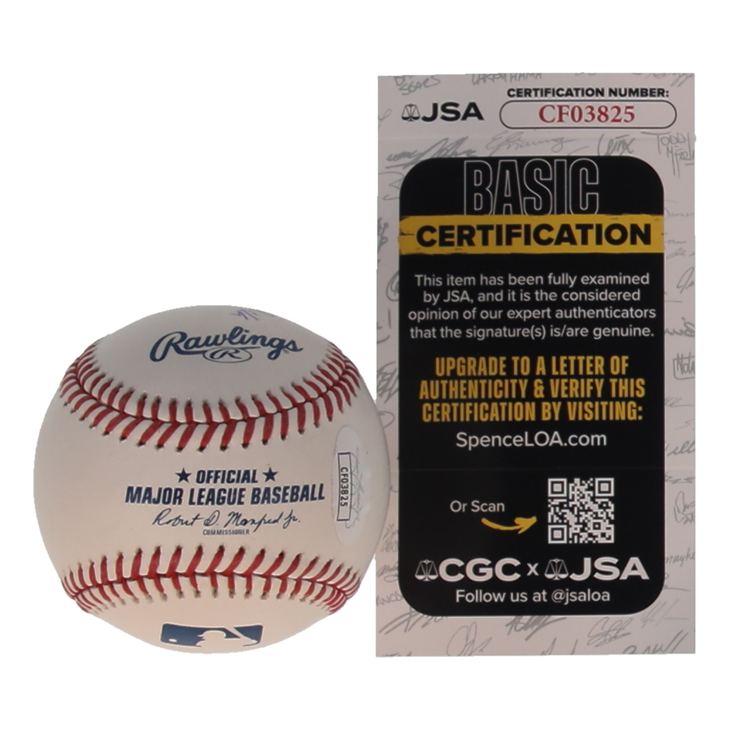Rawlings Official Major League Baseball. Hand-signed and inscribed by Konnor Griffin (Pittsburgh Pirates). Please note, there are stains throughout the baseball.