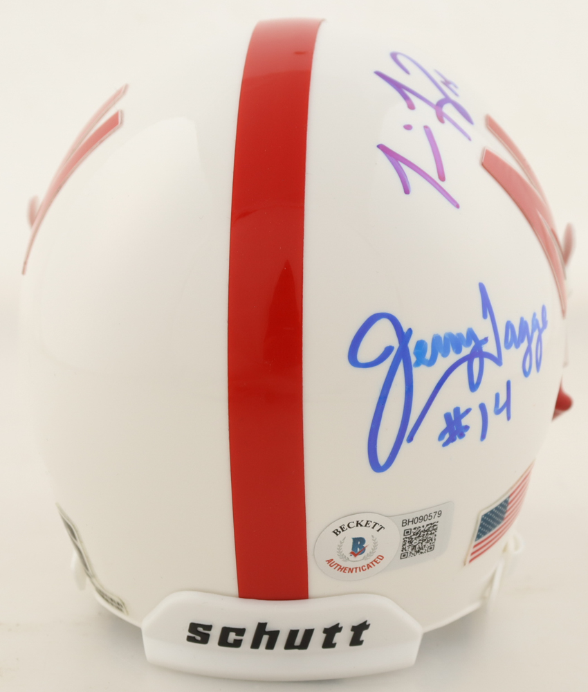 "Presented is a Nebraska Cornhuskers mini helmet, hand signed in permanent ink by three quarterbacks who each led the Huskers to national glory: Jerry Tagge, Tommie Frazier, and Scott Frost. The signatures have been authenticated by Beckett Authentication Services (BAS) and the helmet is accompanied by their Certificate of Authenticity, ensuring both verification and long-term preservation.