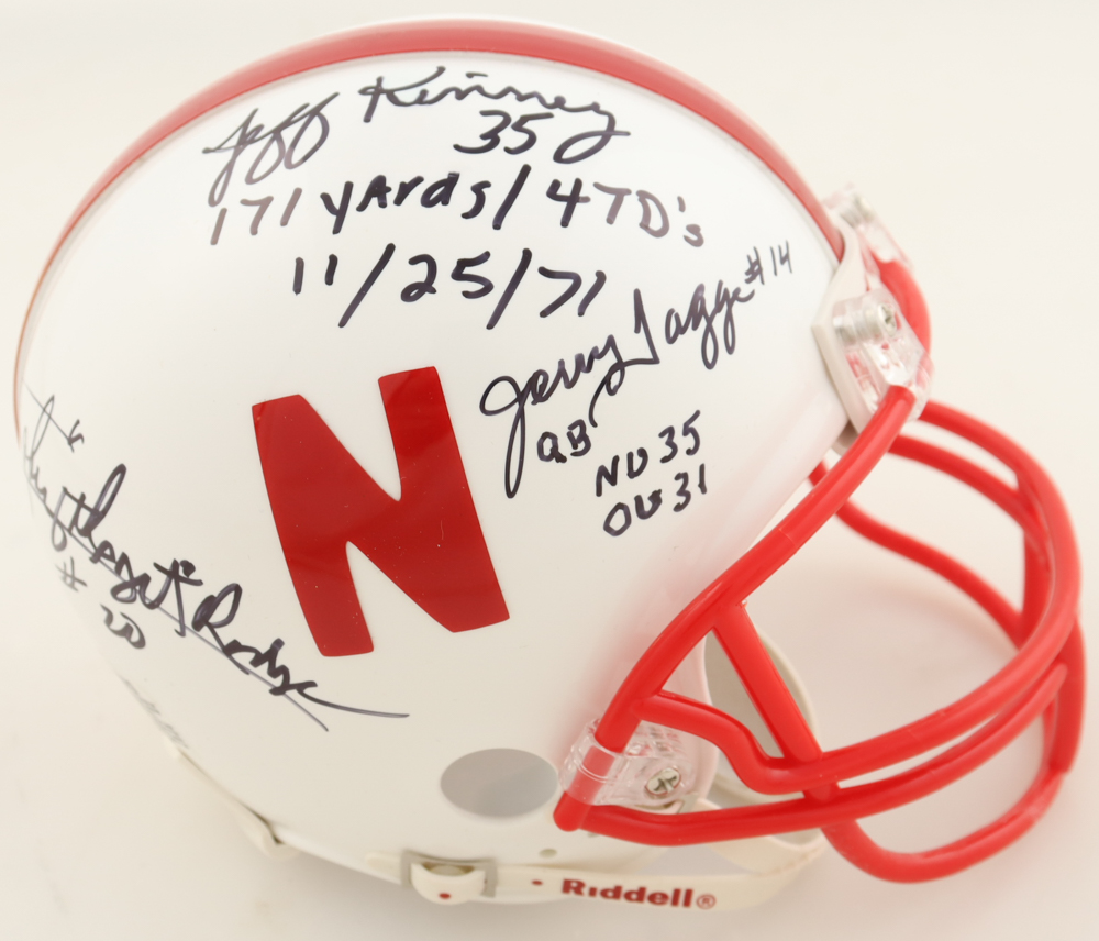 The “Game of the Century” was played on November 25, 1971, when No. 1 Nebraska faced No. 2 Oklahoma in Norman. The Cornhuskers triumphed in a thrilling 35–31 victory, cementing their place in history en route to the 1971 National Championship. This helmet unites the signatures of three players who defined that game and that era of Husker dominance.