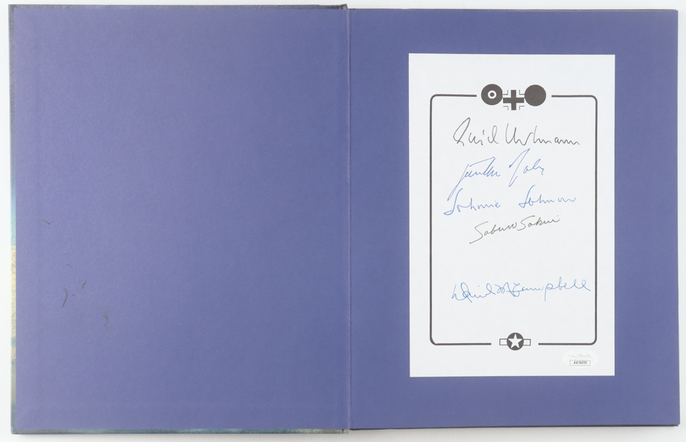 Hardcover book has been hand-signed on the inside cover page by (5) including Gunther Rall, Johnnie Johnson, Saburo Sakai, David McCampbell and Erich Hartmann. Please note, there is some scuffing, corner and edge wear on the cover.