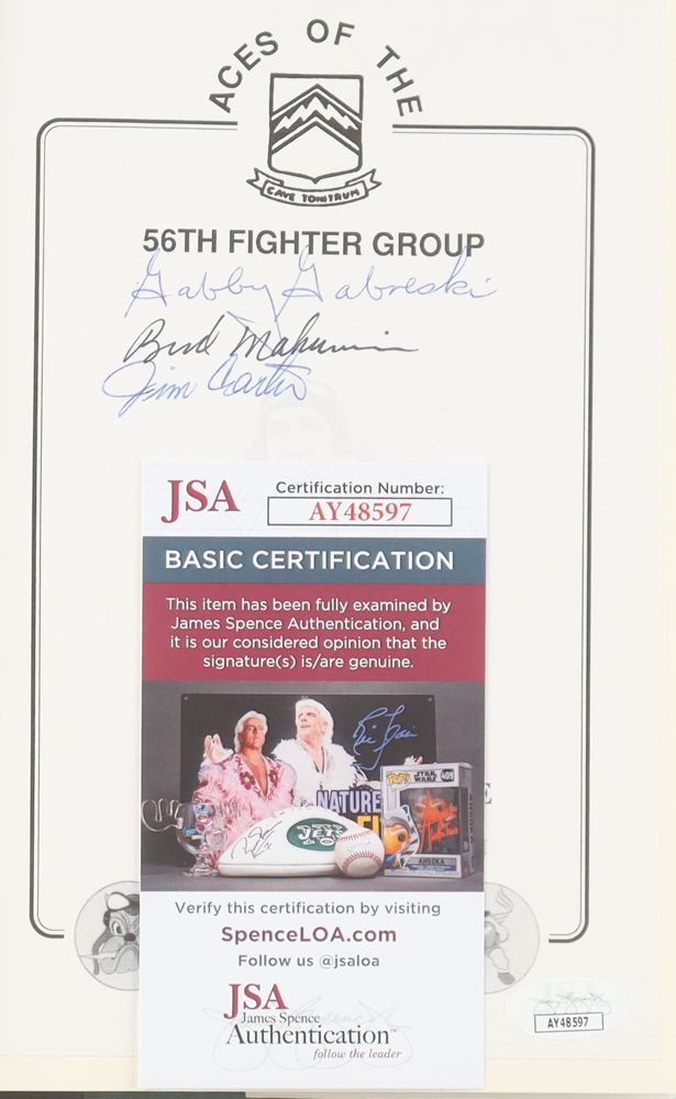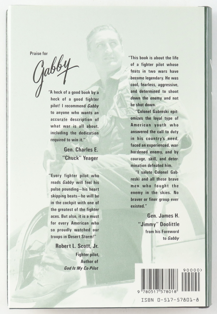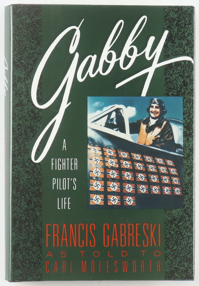 "Gabby: A Fighter Pilot's Life" Hardcover Book has been hand-signed on the inside cover page by Gabby Grabeski, Walker Muhrin and James Carter. Please note, there is some scuffing as well as corner and edge wear on the cover.