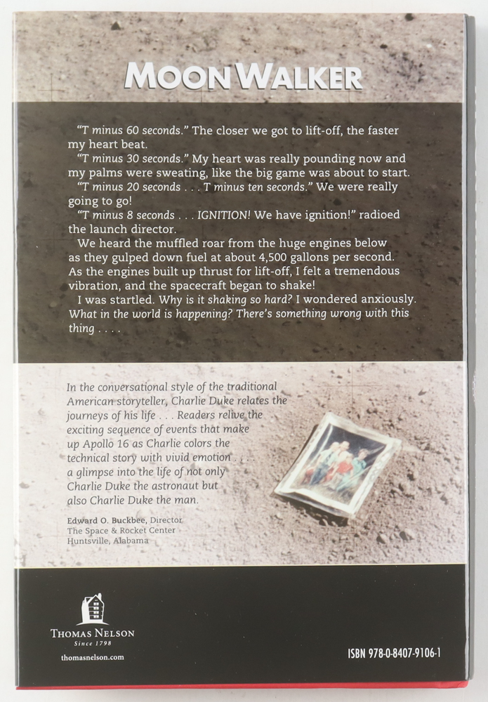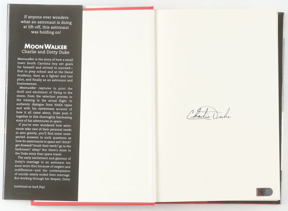 "MoonWalker" hardcover book has been hand-signed on the inside cover page by Charles Duke. Please note, there is some scuffing and edge wear on the cover.