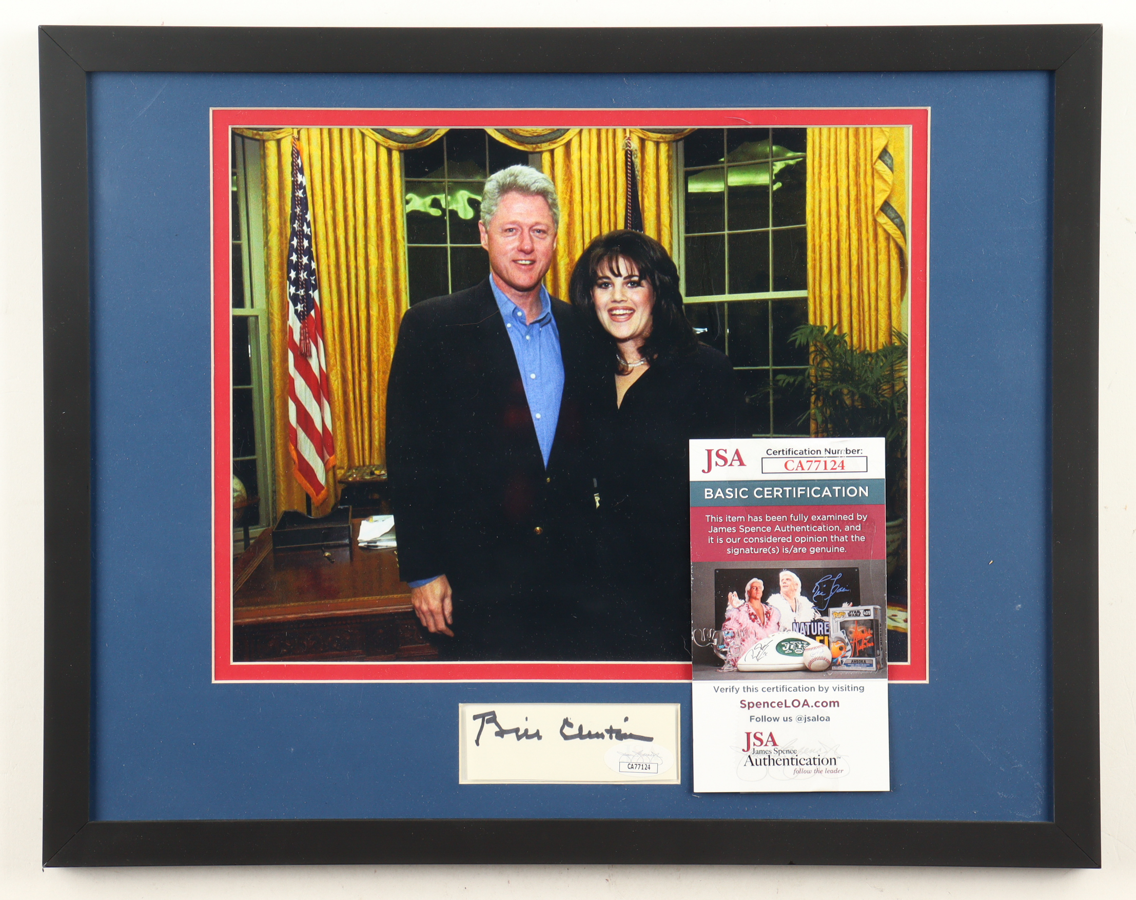 Custom frame measures 12" x 15" in size. Features a cut that has been hand-signed by Bill Clinton.