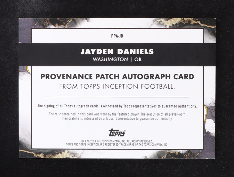 Jayden Daniels 2024 Topps Inception Provenance Patch Autographs Green #PPAJD RC #102/150