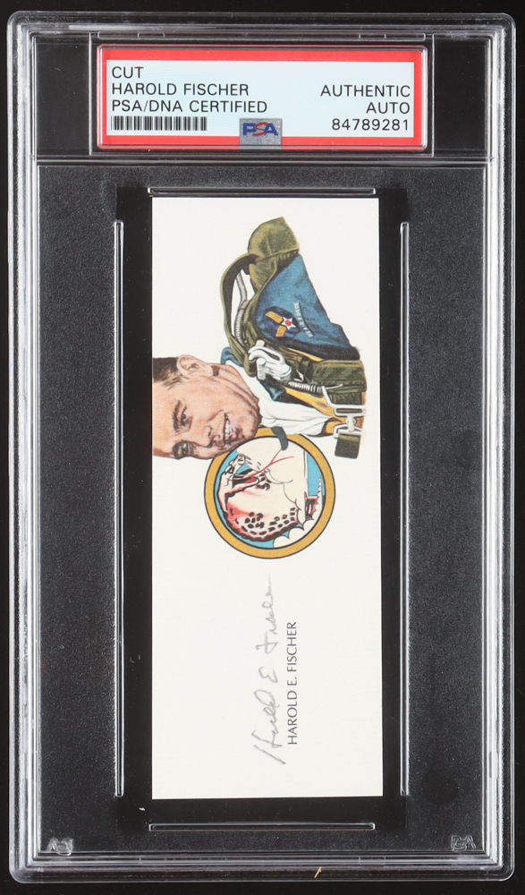 Cut measures approximately 2" x 5" in size has been hand-signed by Harold Fischer (D. 2009).