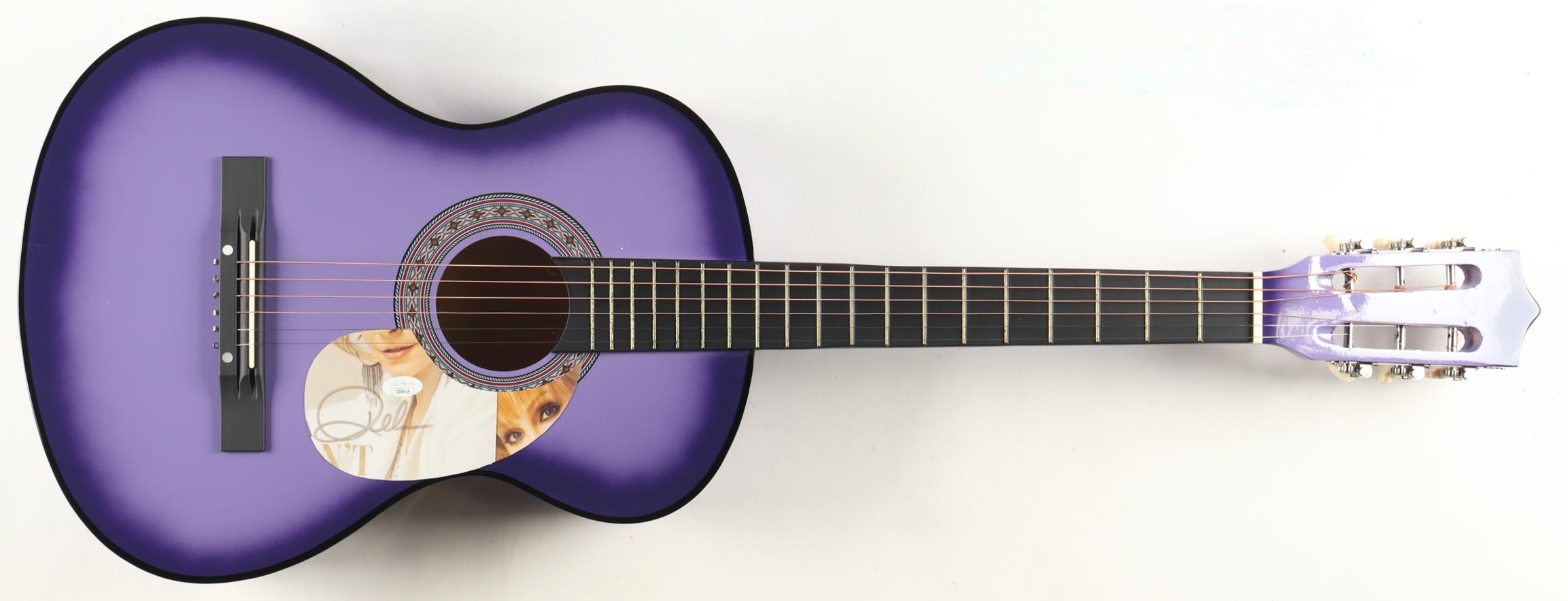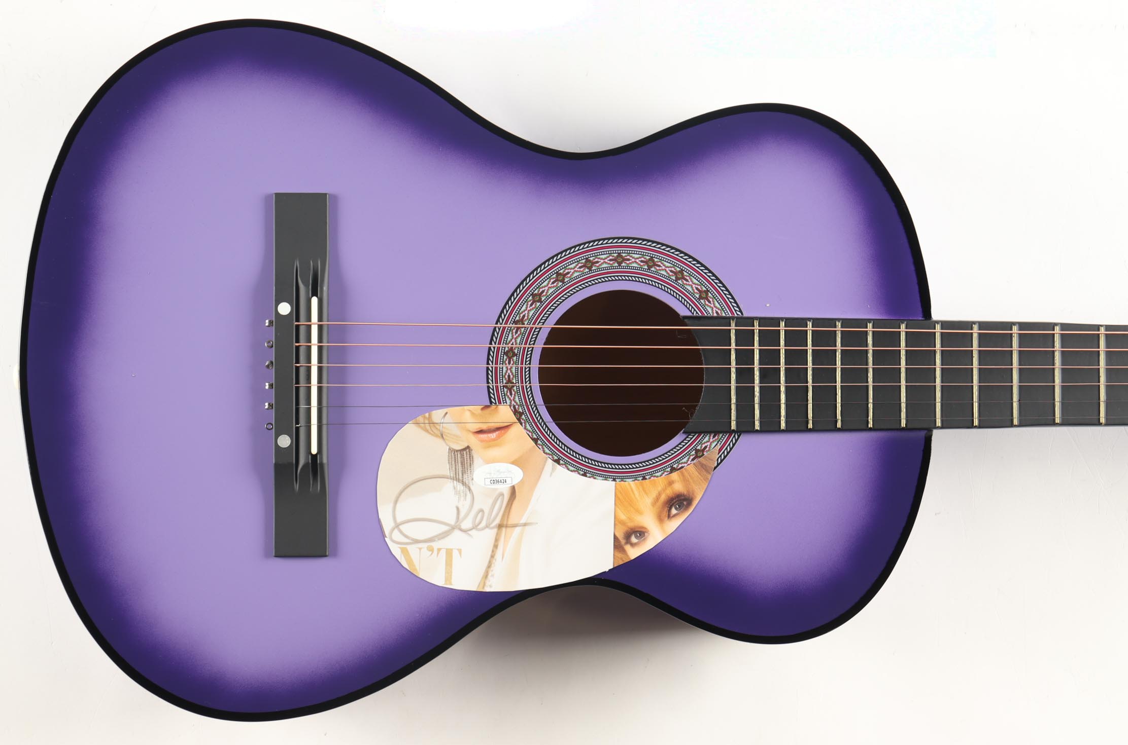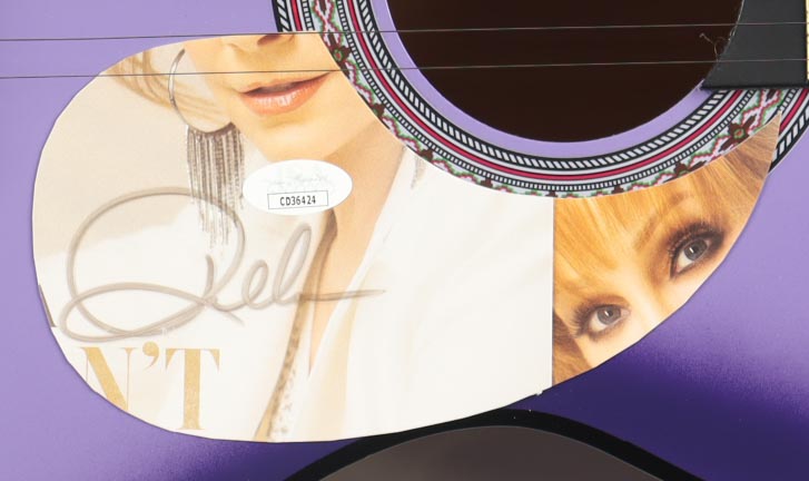 Acoustic guitar measures approximately 38" in length and has been hand-signed on a cut that has been repurposed as the pick-guard by Reba McEntire (HOF).