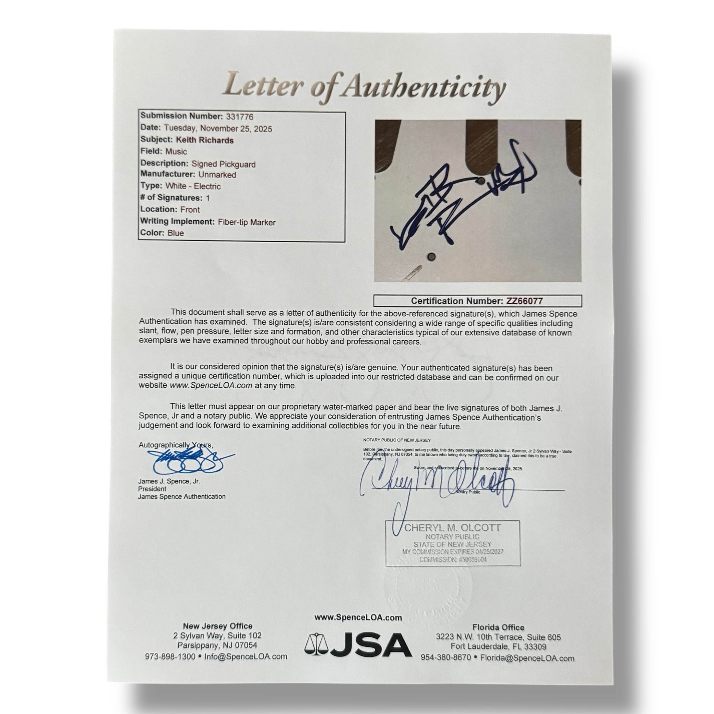 Authentication: JSA Hologram and Letter of Authenticity (LOA)