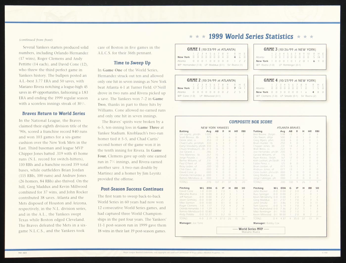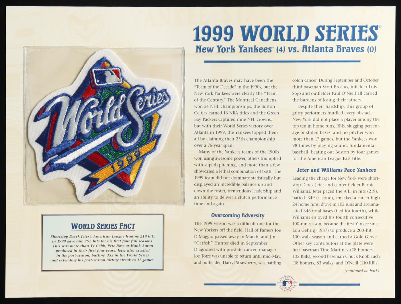 1999 World Series vintage uniform patch. Display also includes an informational article.