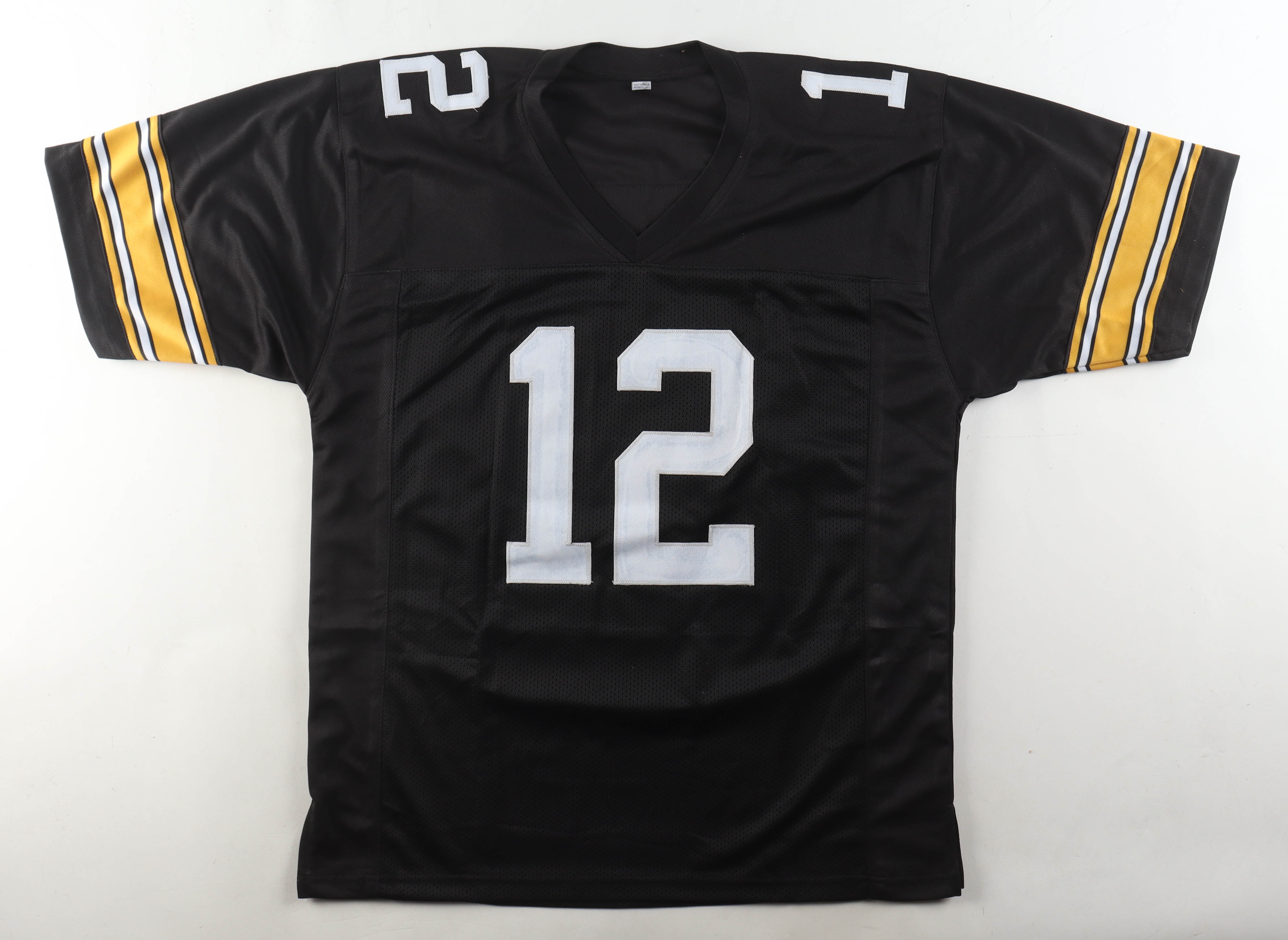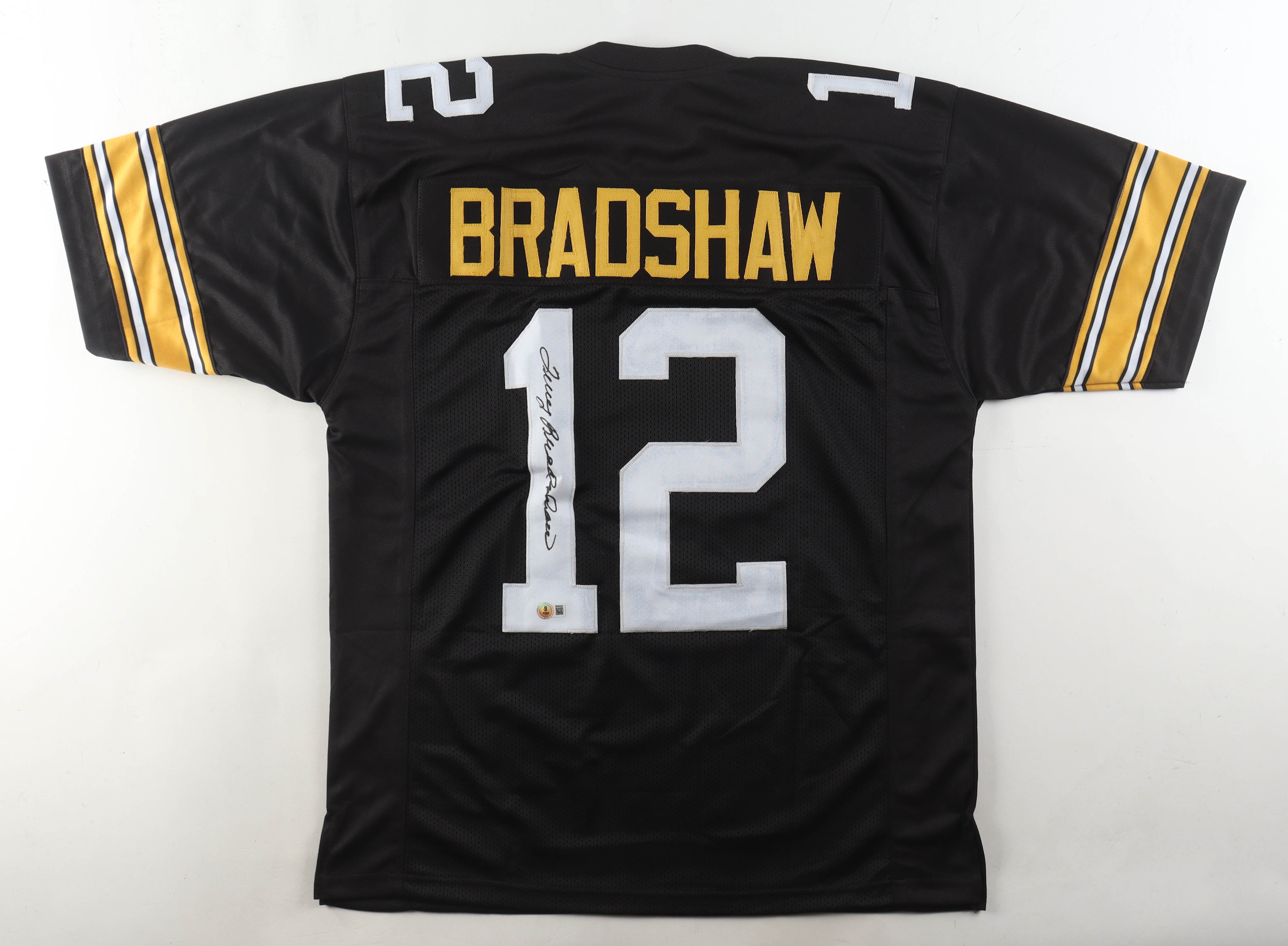 Custom jersey with everything sewn on, size XL. Hand signed by Terry Bradshaw (HOF). Please note, glue is visible through the reverse number. See photos regarding the condition of the item.