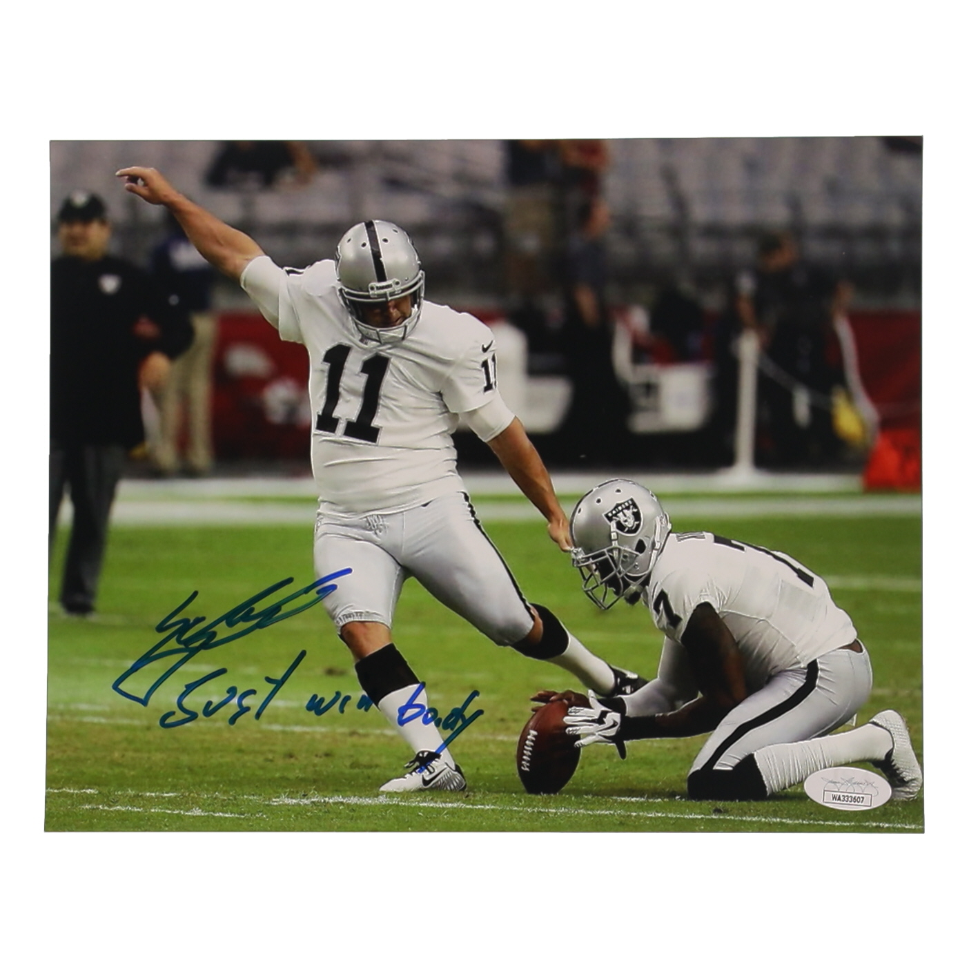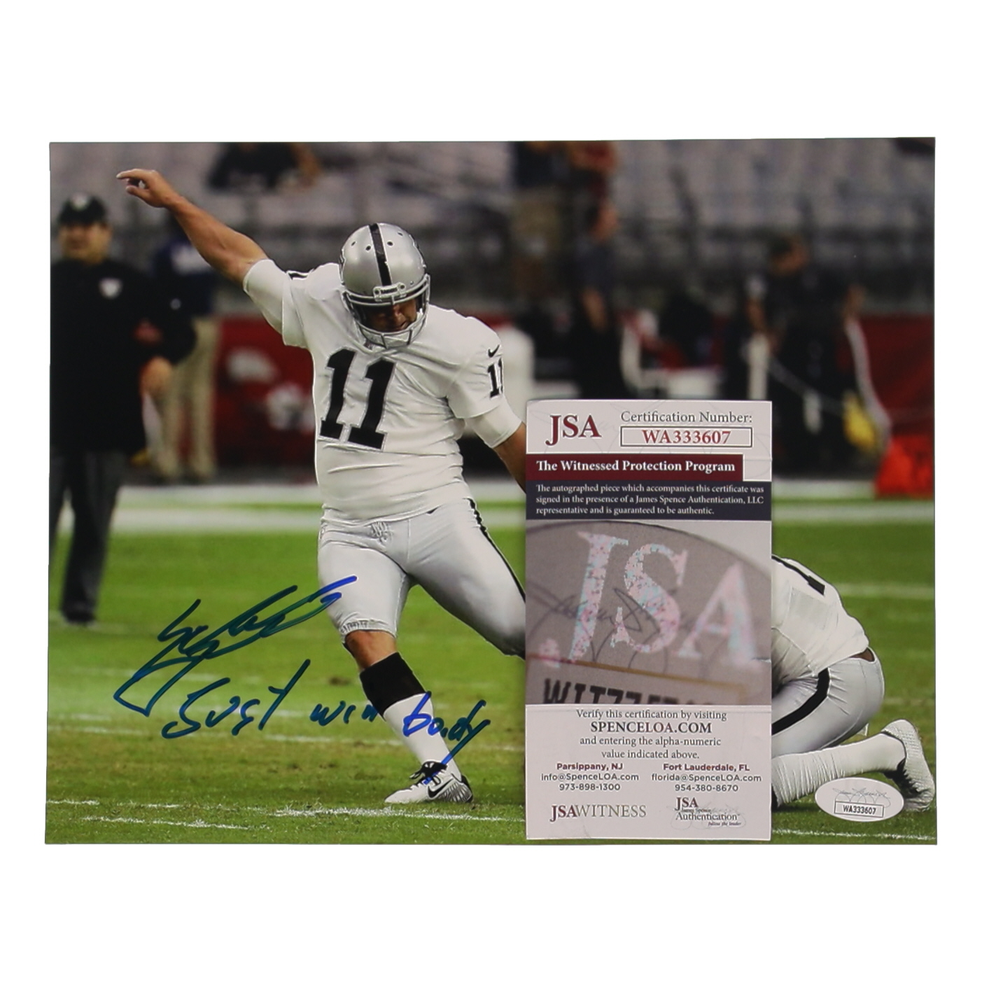 Photo measures 8" x 10" in size. Hand-signed and inscribed by Sebastian Janikowski (Oakland Raiders).