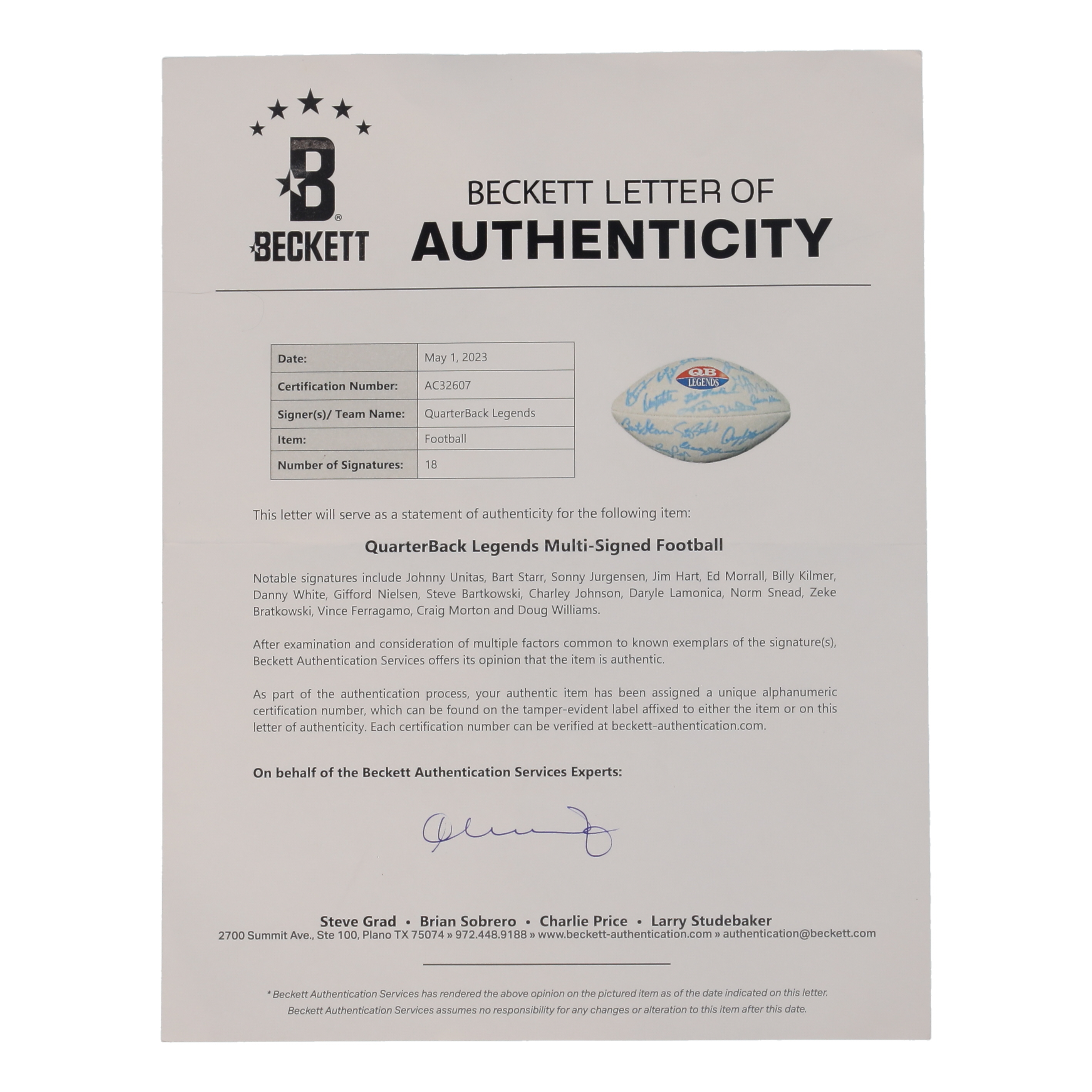 QB Legends football has been hand-signed by (18) with Johnny Unitas, Bart Starr, Sonny Jurgensen, Jim Hart, Ed Morrall, Billy Kilmer, Danny White, Gifford Nielsen, Steve Bartowski, Charley Johnson, Daryle Lamonica, Norm Snead, Zeke Bratkowski, Vince Ferragamo, Craig Morton, Doug Williams and (2) others.