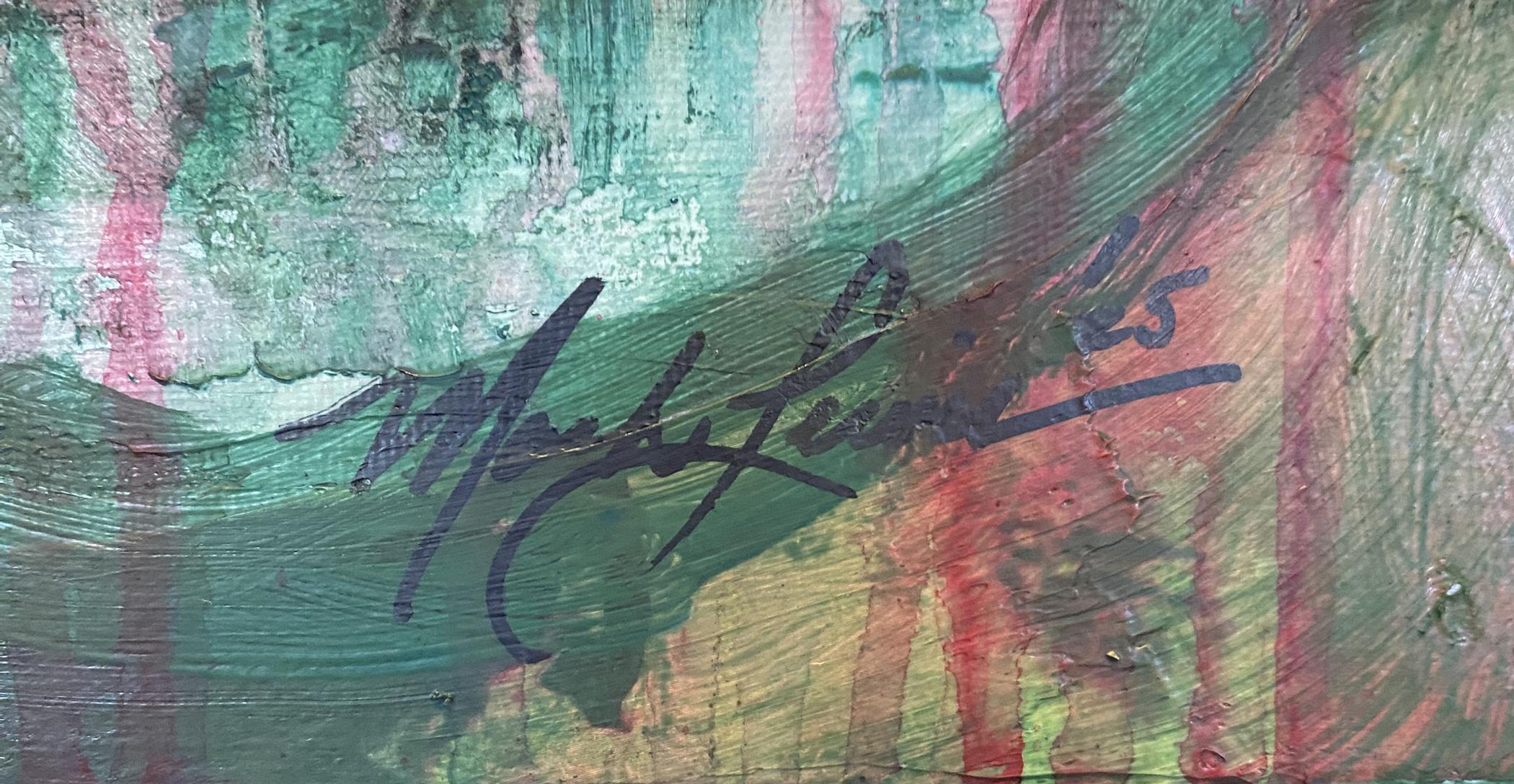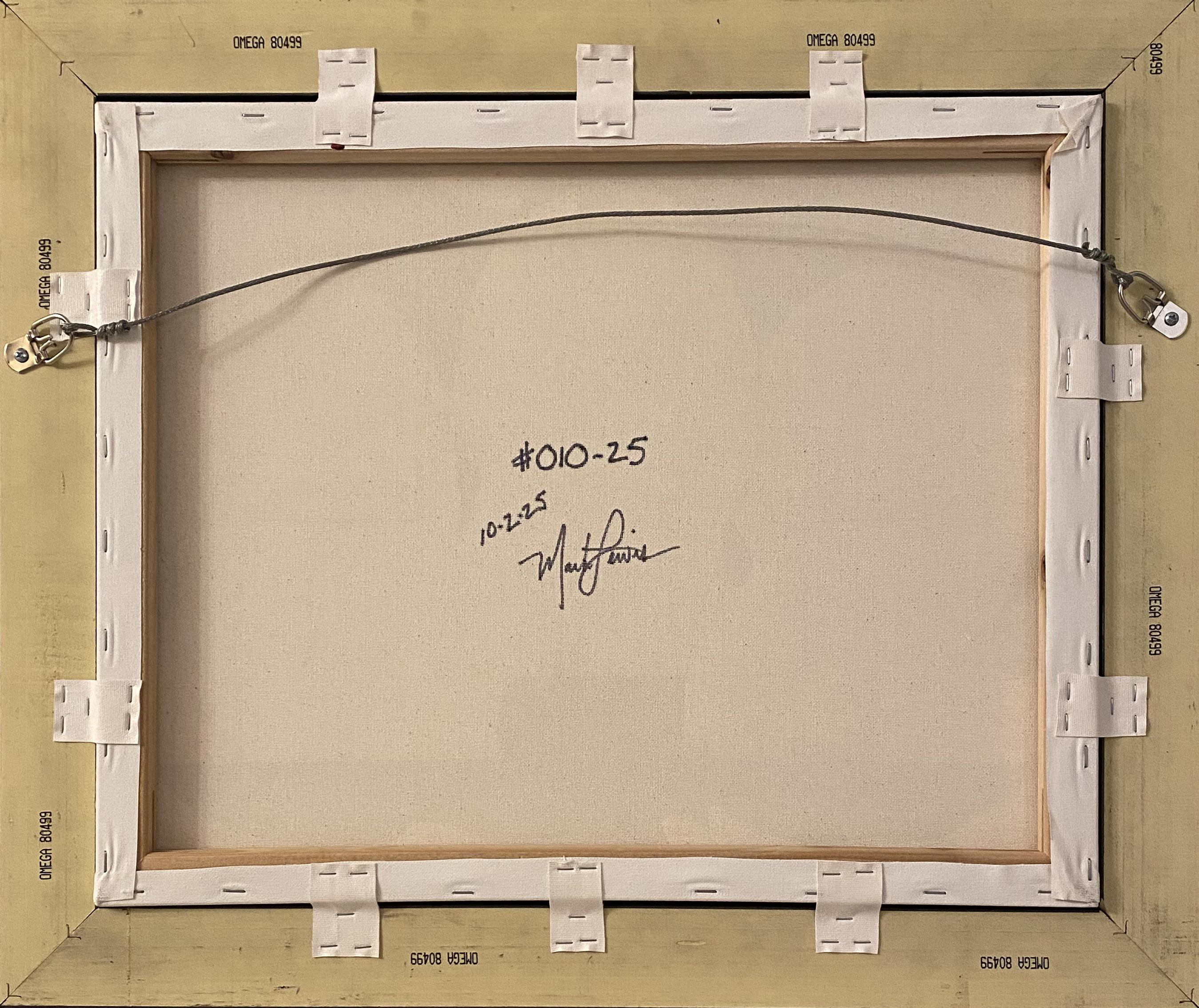 Custom framed display measures 25" x 21" in size with a matte black solid wood frame. 010-25 by Mark Lewis is a dynamic exploration of color, texture, and emotion. The composition combines expressive realism with abstract undertones, showcasing Lewis' command of acrylic medium through layered brushwork and luminous tonal transitions. Vivid hues and rhythmic movement define the piece, giving it both immediacy and depth - a visual conversation between structure and spontaneity.