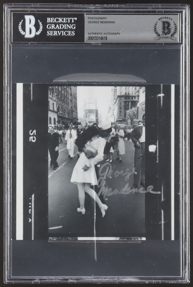 Photo measures approximately 5" x 5.5" in size and has been hand-signed by George Mendonsa (D. 2019). Please note, there is a crack on the front of the encapsulation.