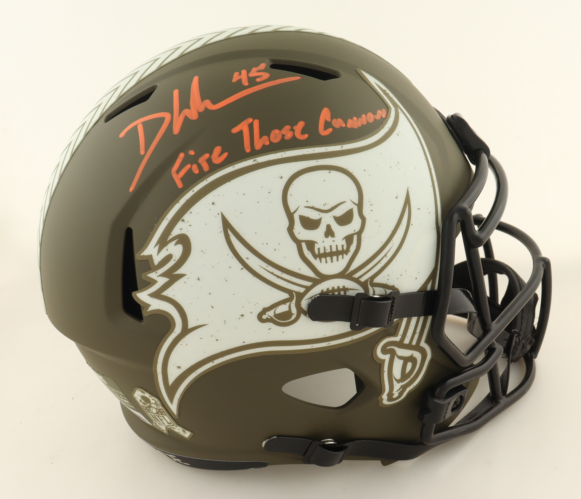 Devin White Signed Buccaneers Salute To Service Speed Full Size Helmet Inscribed "Fire Those Cannons" (Beckett)