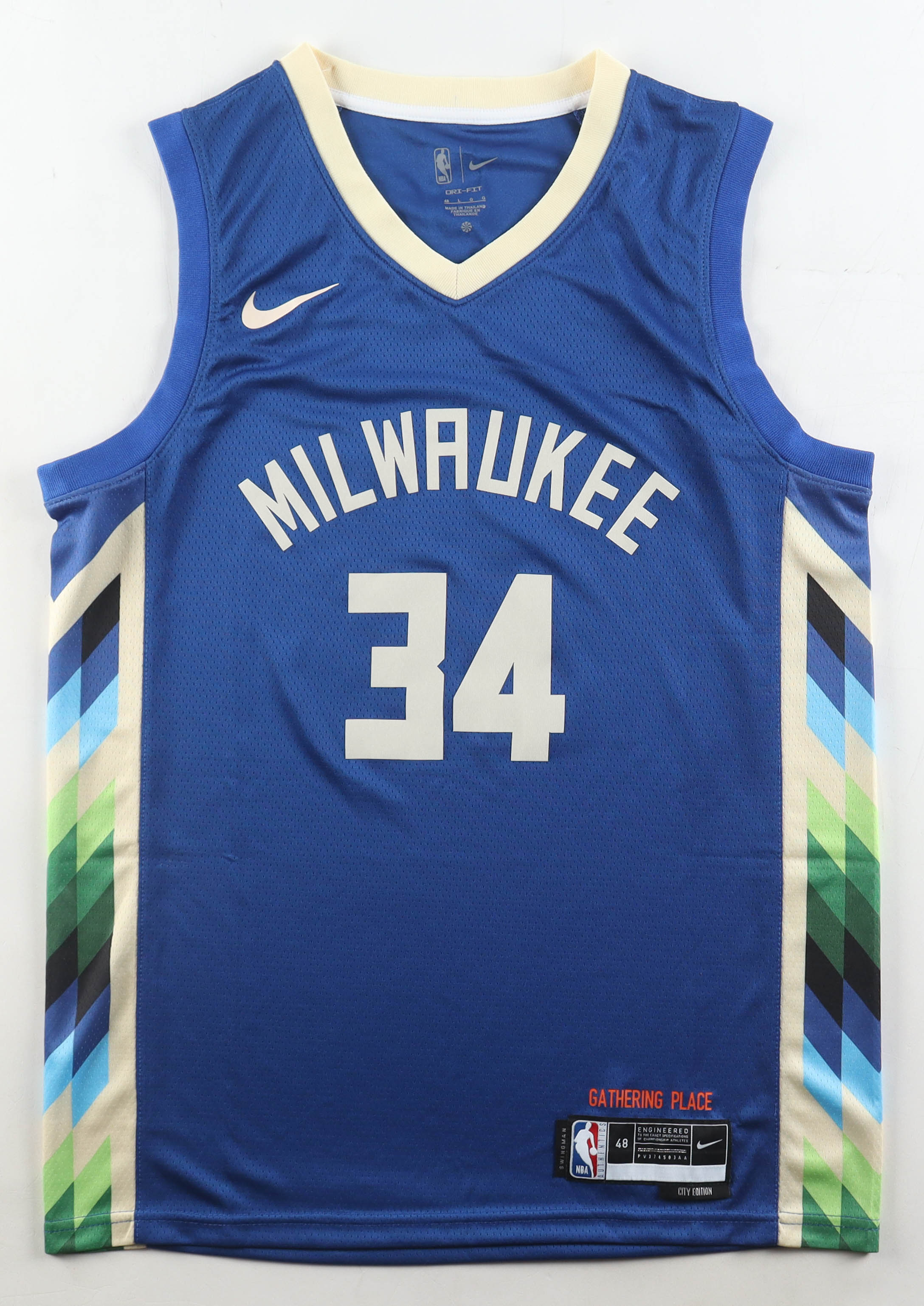 Nike jersey with everything pressed on, size 48. Hand-signed by Giannis Antetokounmpo (Milwaukee Bucks).