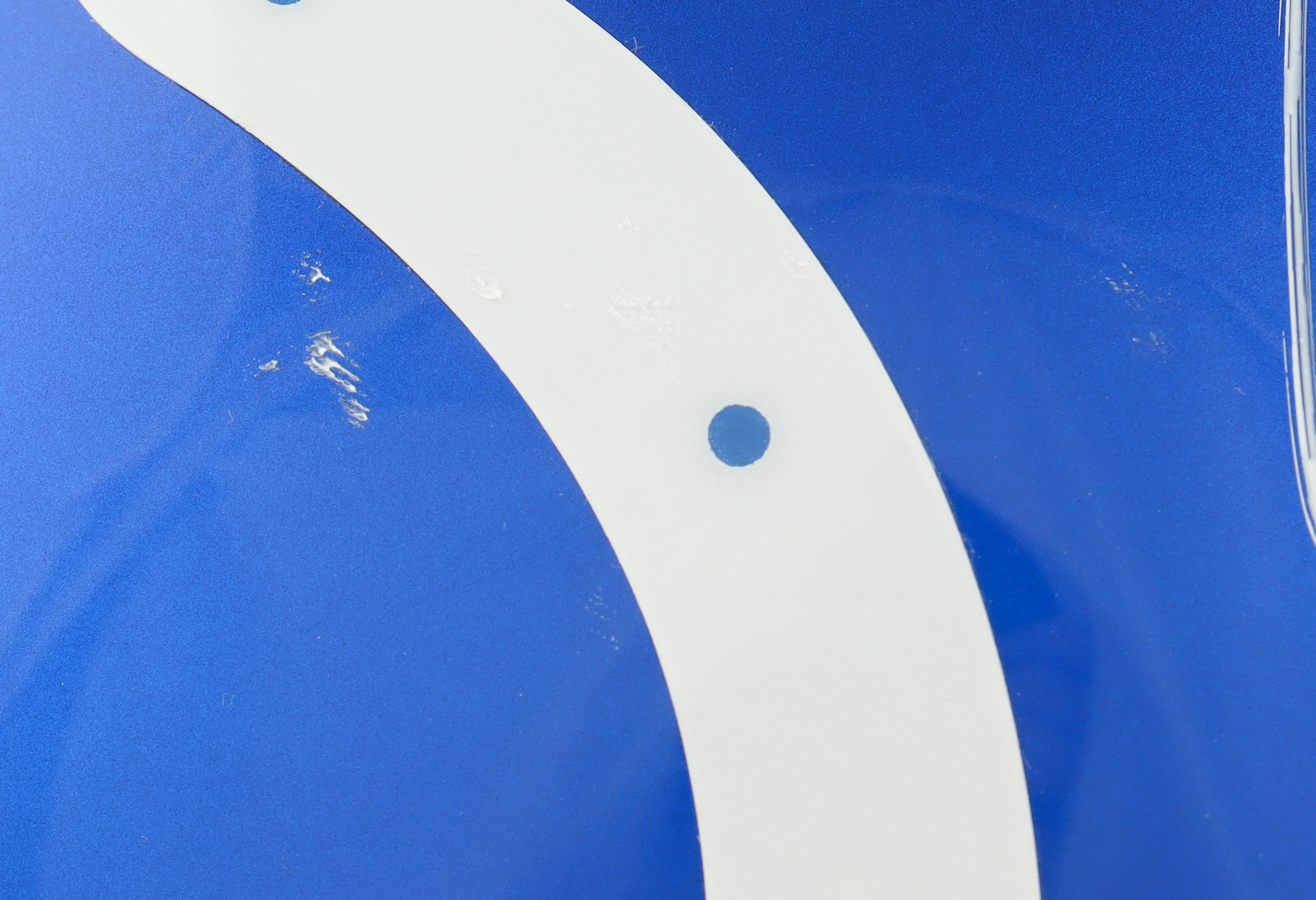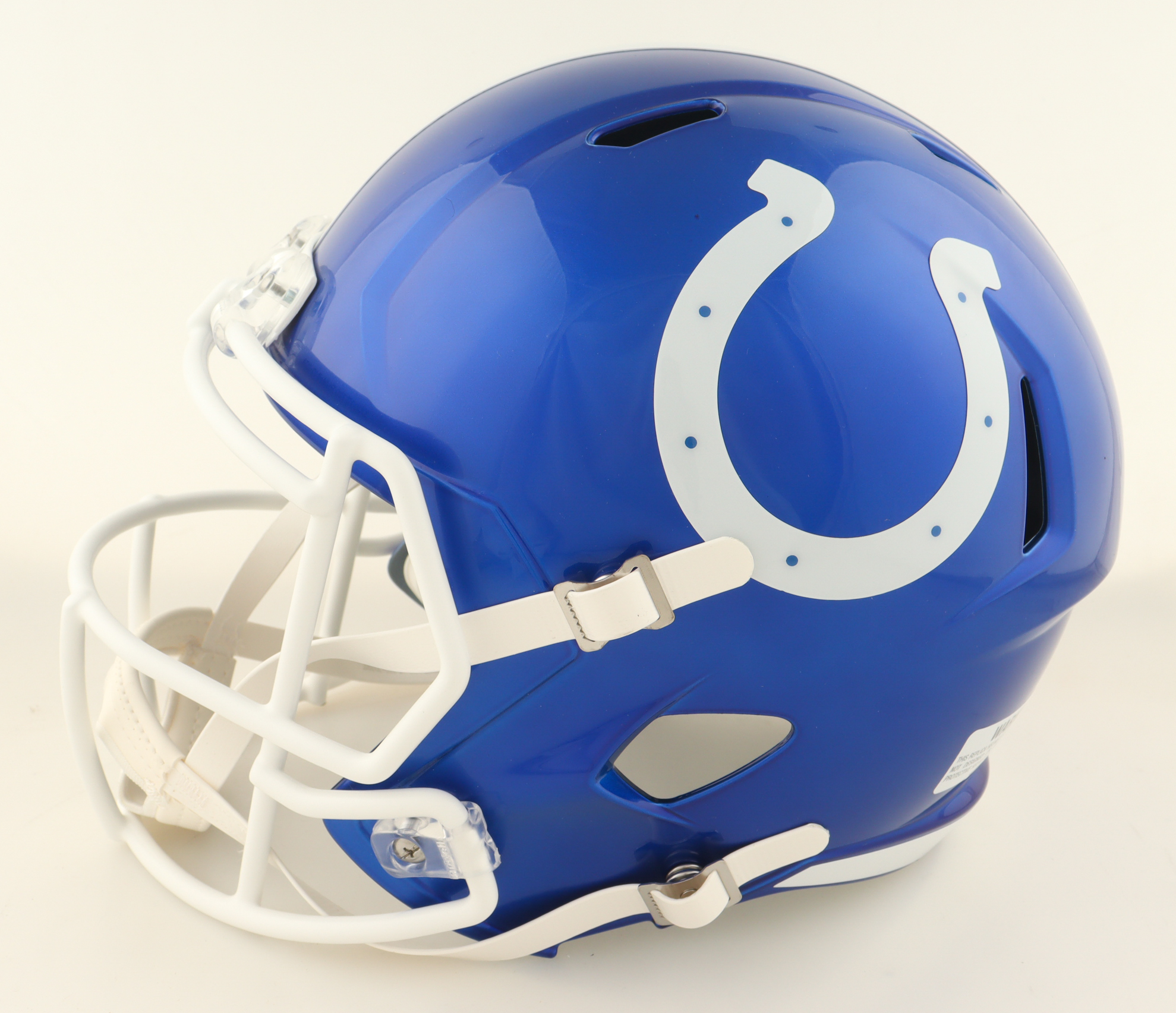 Riddell Indianapolis Colts full-size replica flash alternate speed helmet. Hand-signed and inscribed by Riley Leonard. Please note there is a smudge next to the decal on the signed side of the helmet.