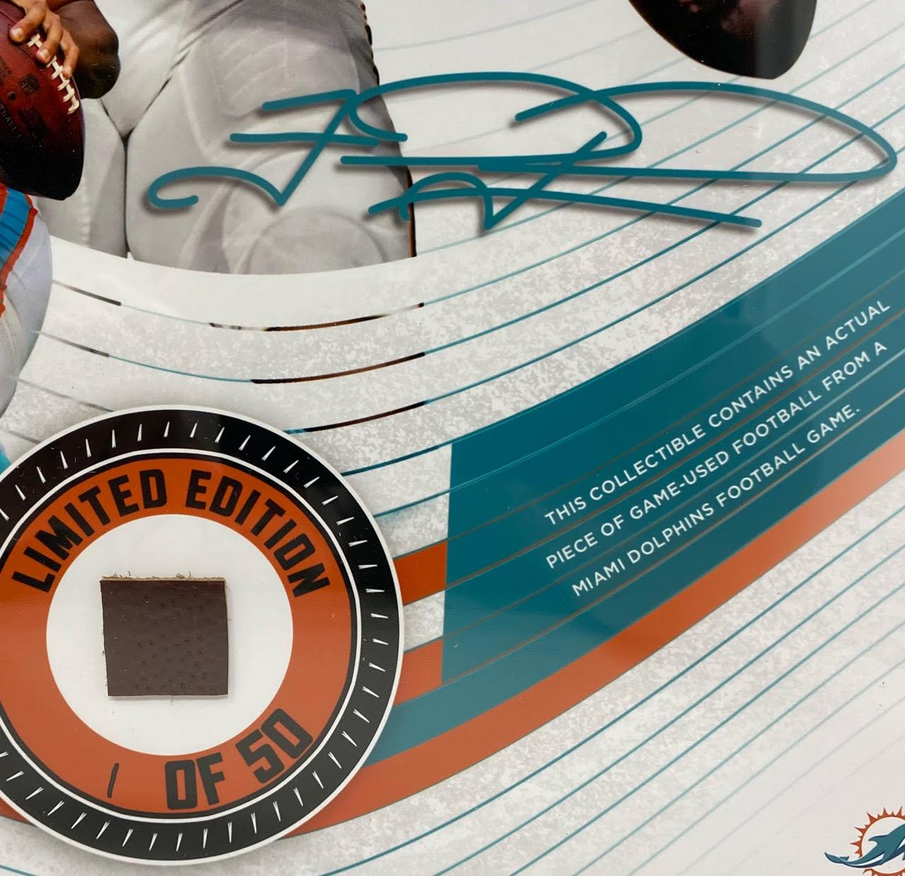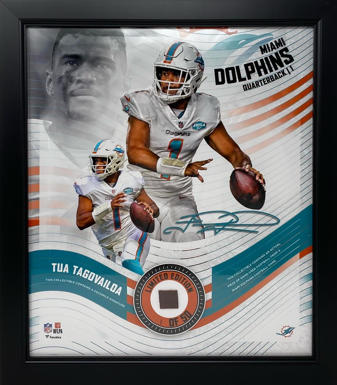Custom framed display measures 15" x 17" in size and features a game-used football piece and a photo collage of Tua Tagovailoa (Miami Dolphins). Display is limited edition and has been numbered #1/50.
