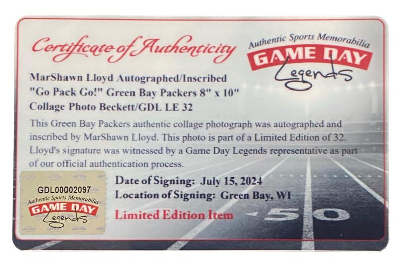 Photo measures 8” x 10” in size and has been hand-signed by MarShawn Lloyd (Green Bay Packers). This photo is limited to 32 and you will receive number "1" from the edition.