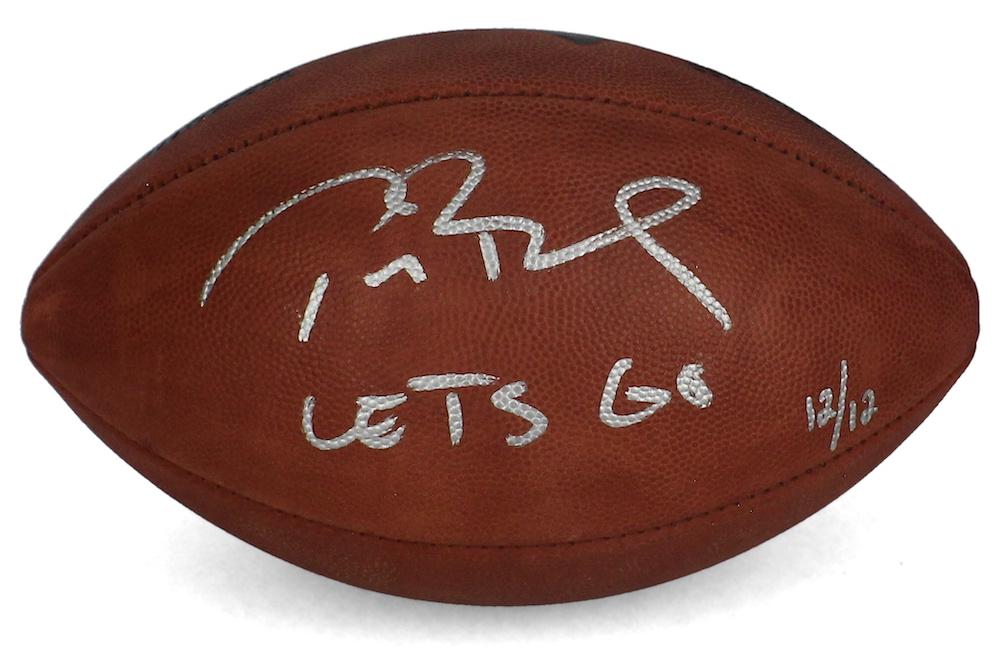 Wilson New England Patriots Logo "The Duke" Metallic football has been hand-signed by Tom Brady. This football is limited edition #12/12.