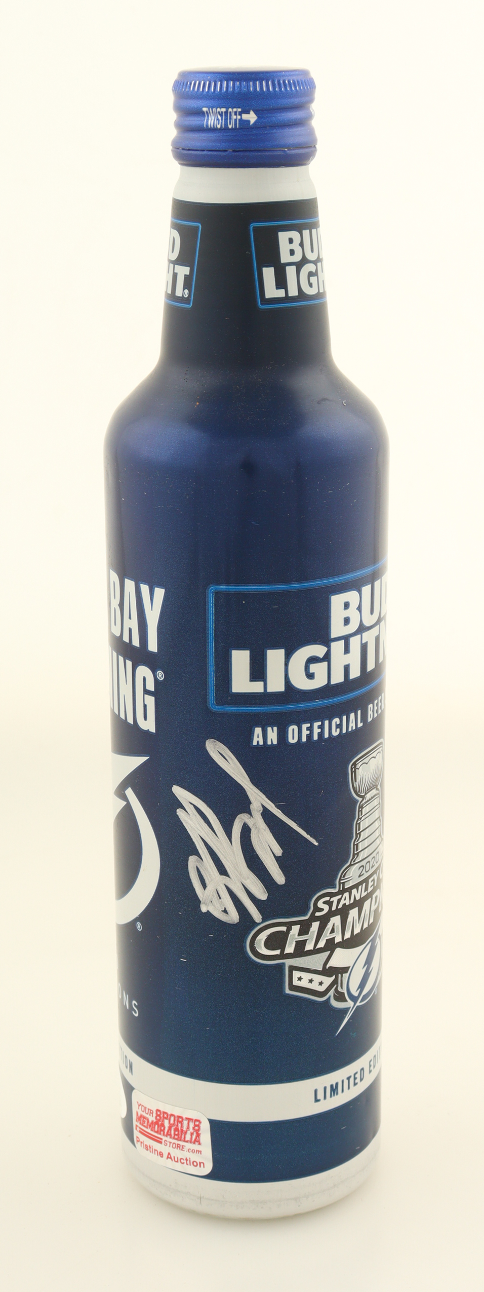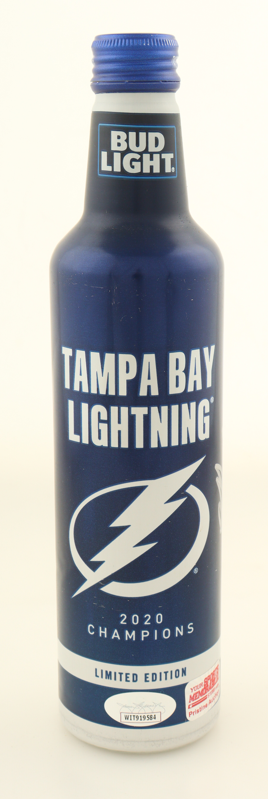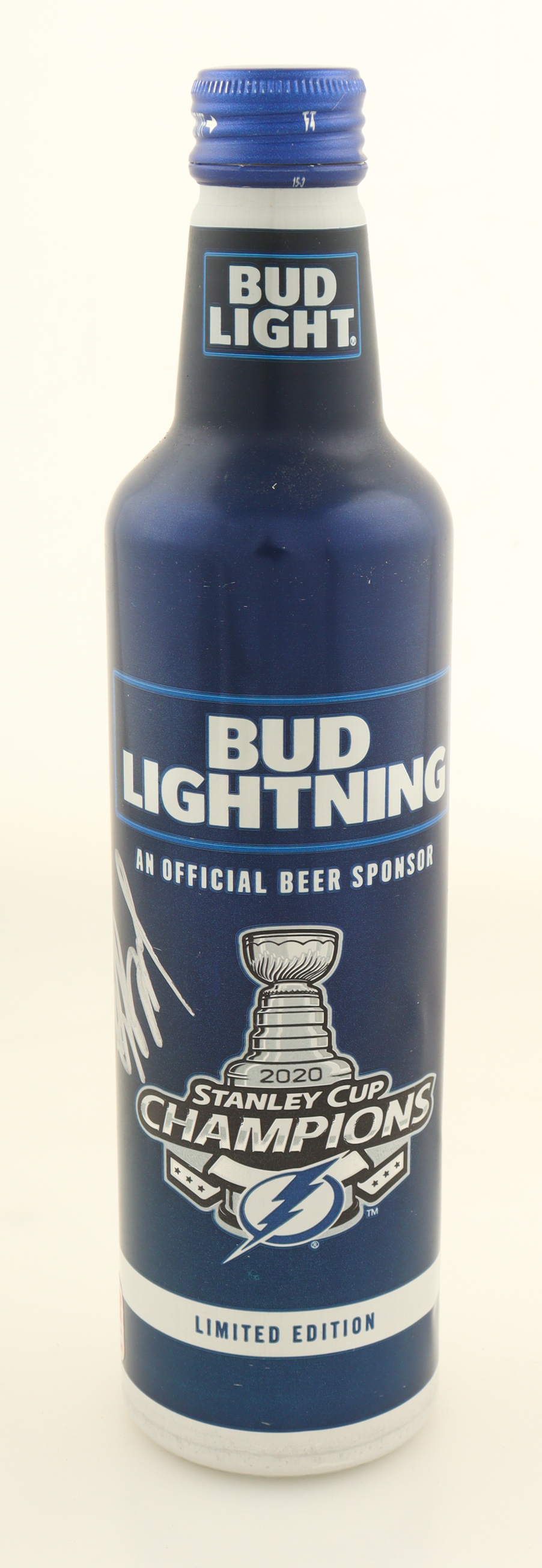Tampa Bay Lightning 2020 Stanley Cup Champions Logo Bud Light Beer Bottle. Hand-signed by Andrei Vasilevskiy.