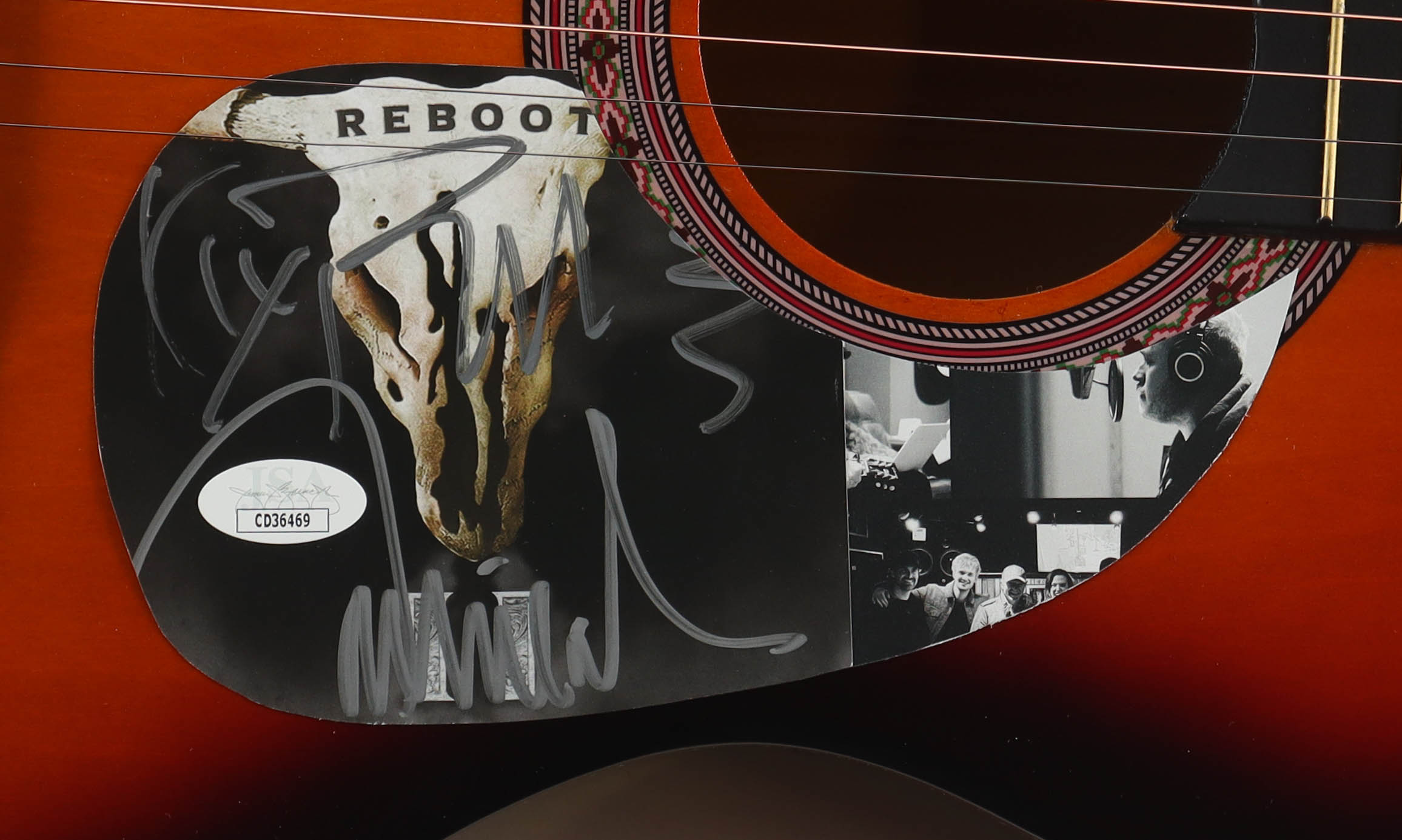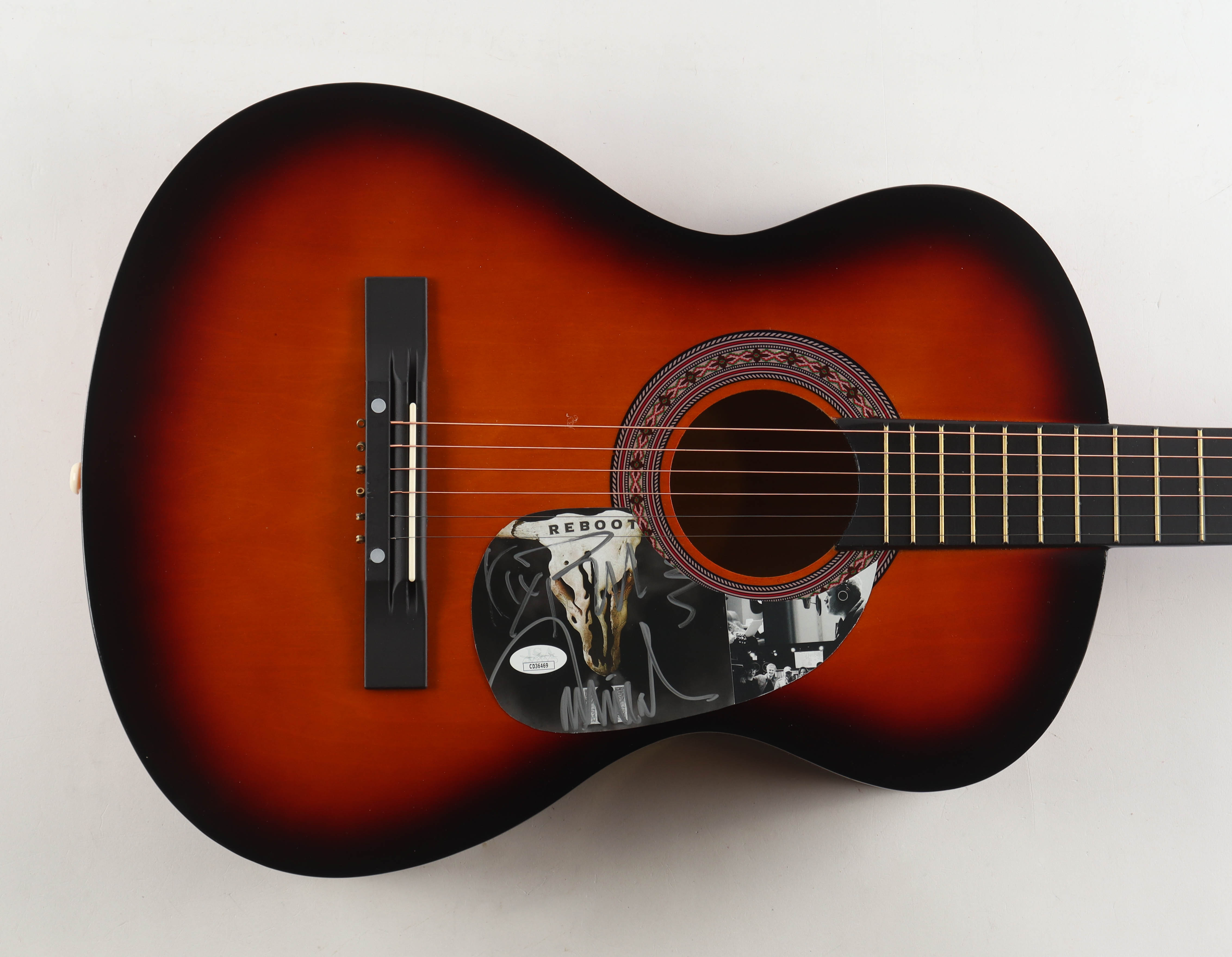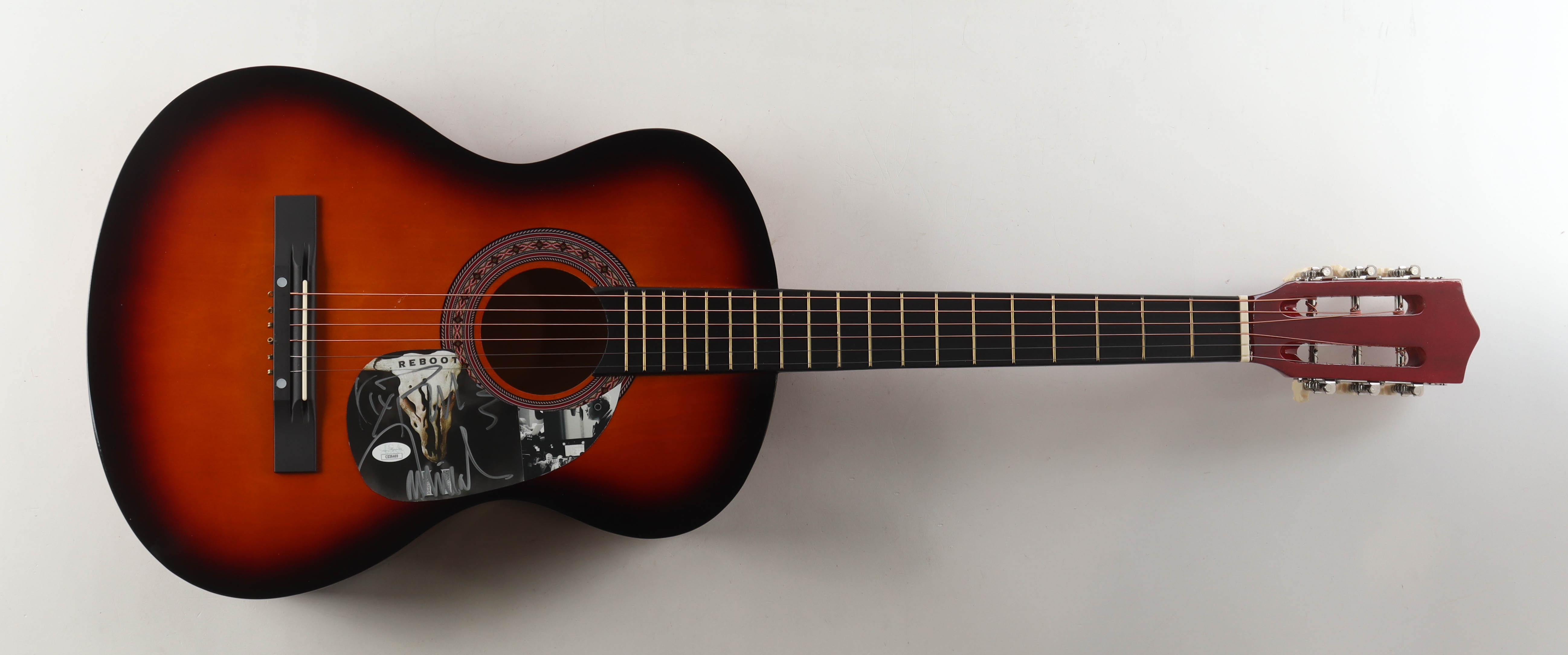 Acoustic guitar measures approximately 38" in length and has been hand-signed on a CD cover that has been repurposed as a pick-guard by Kix Brooks and Ronnie Dunn.