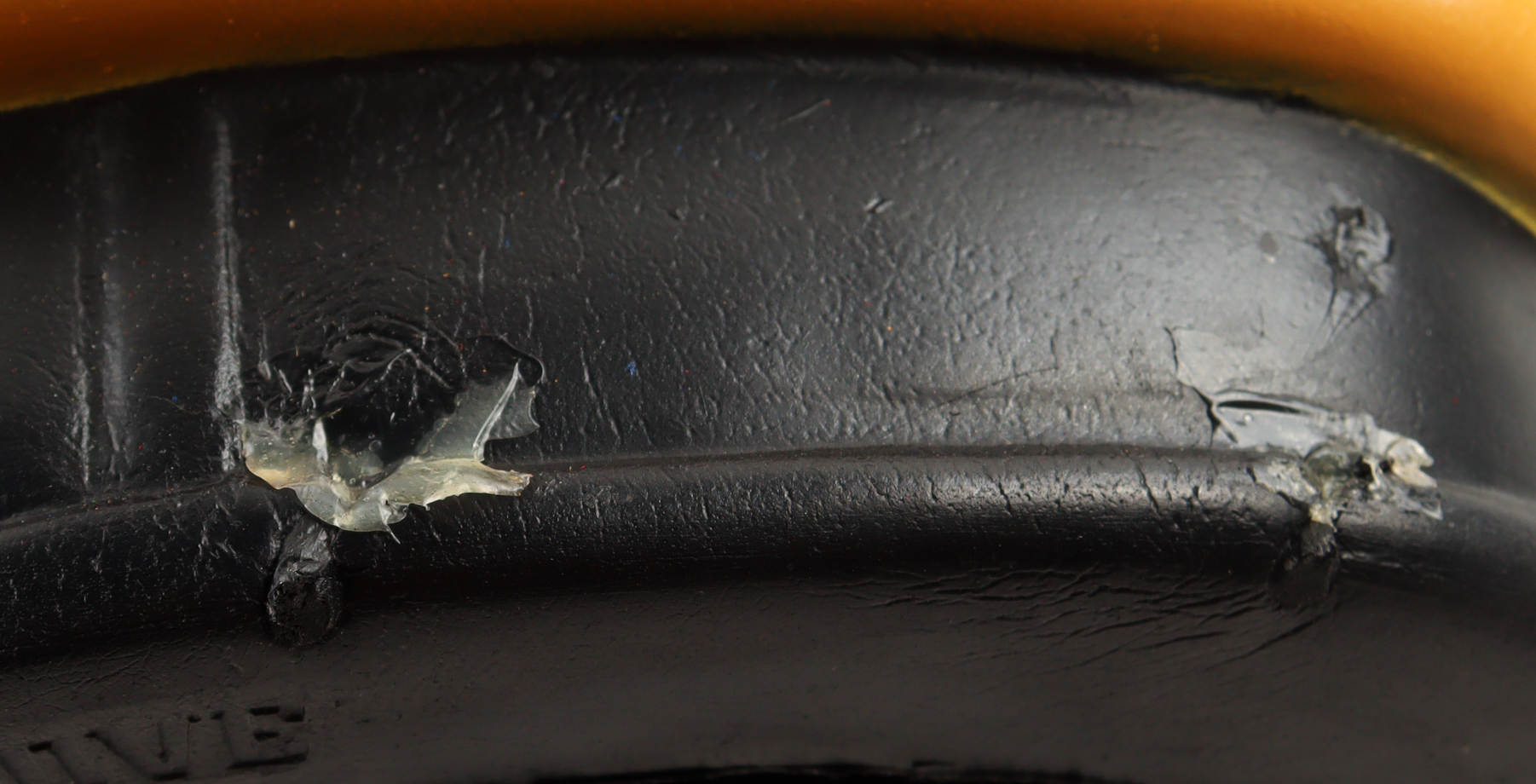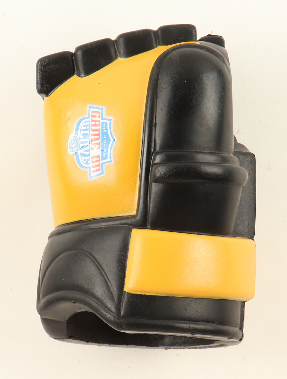 Boston Bruins Stanley Cup Champions logo goalie glove beer holder. Hand-signed by Brad Marchand and Patrice Bergeron. Please note, there is scraping and residue on the beer holder - see photos for more details.