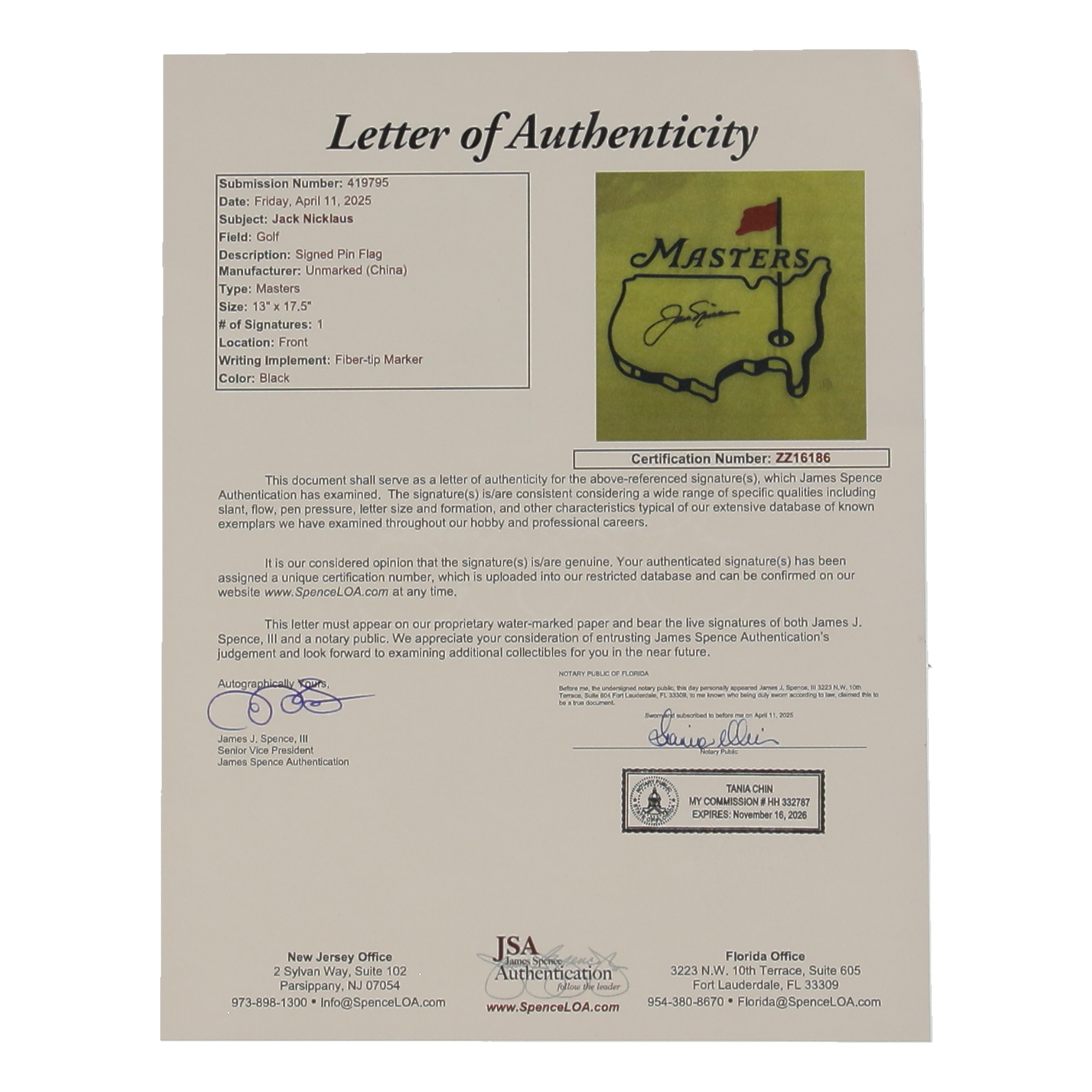 Jack Nicklaus Signed Masters Tournament Golf Pin Flag (JSA)