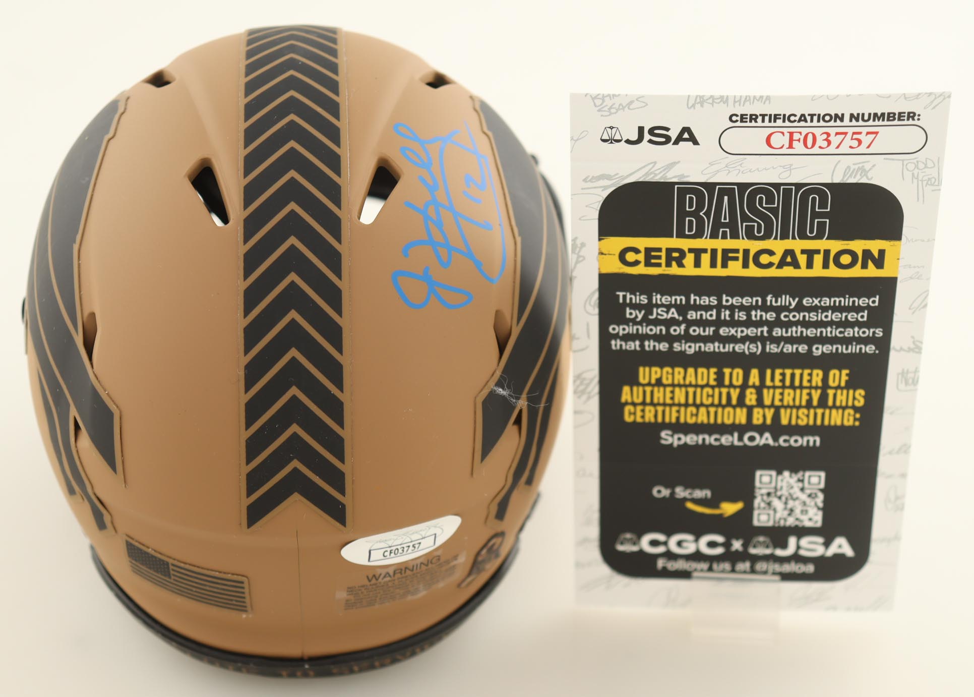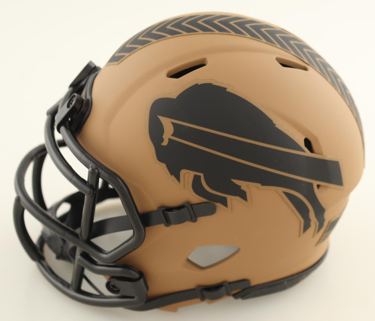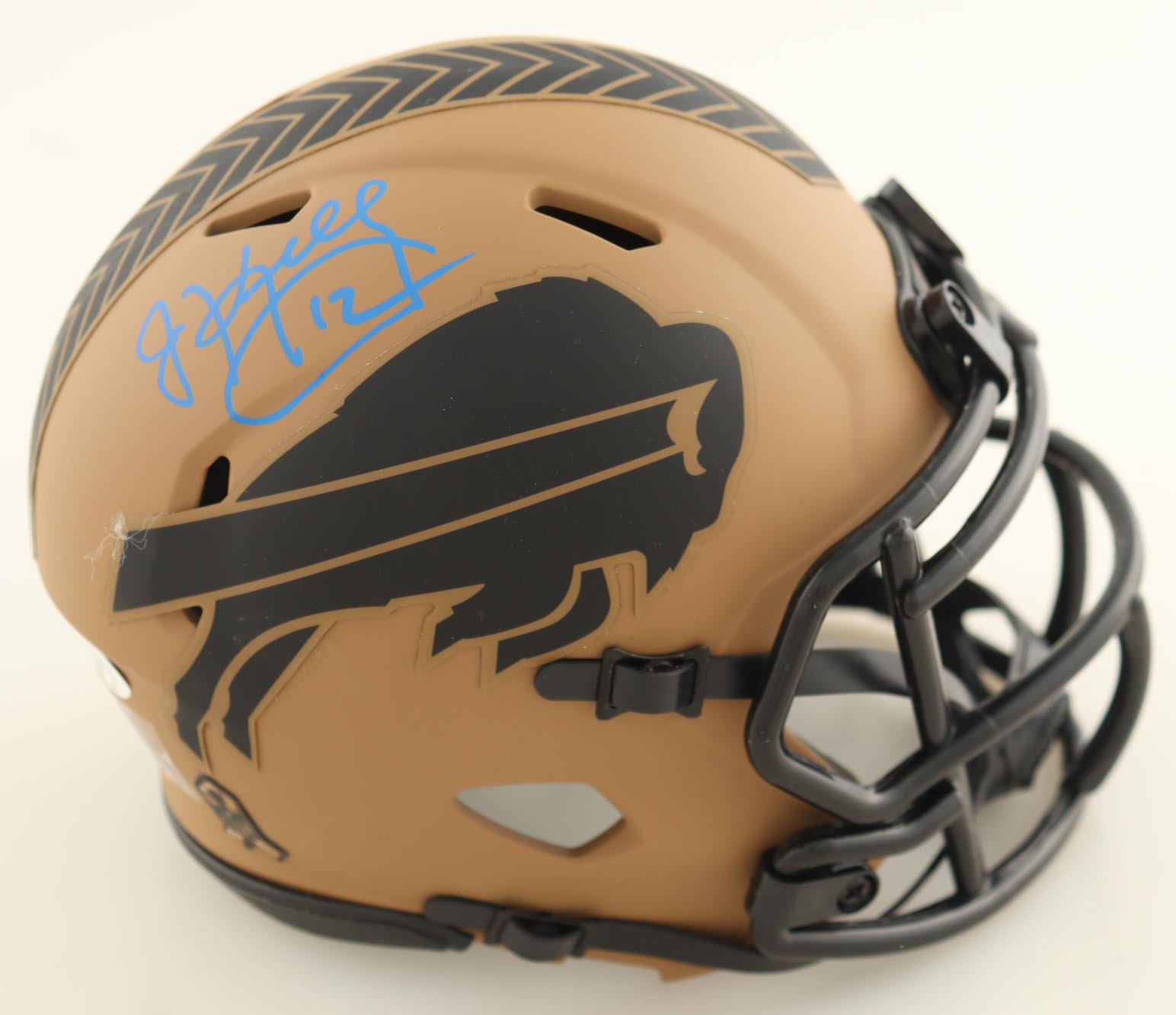 Riddell Buffalo Bills Salute To Service Alternate speed mini helmet has been hand-signed by Jim Kelly.