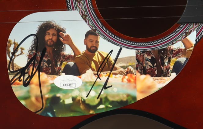 Acoustic guitar measures approximately 38" in length and has been hand-signed on a cut that has been repurposed as a pick-guard by Dan Smyers and Shay Mooney.