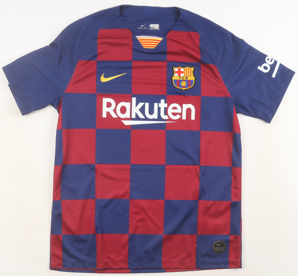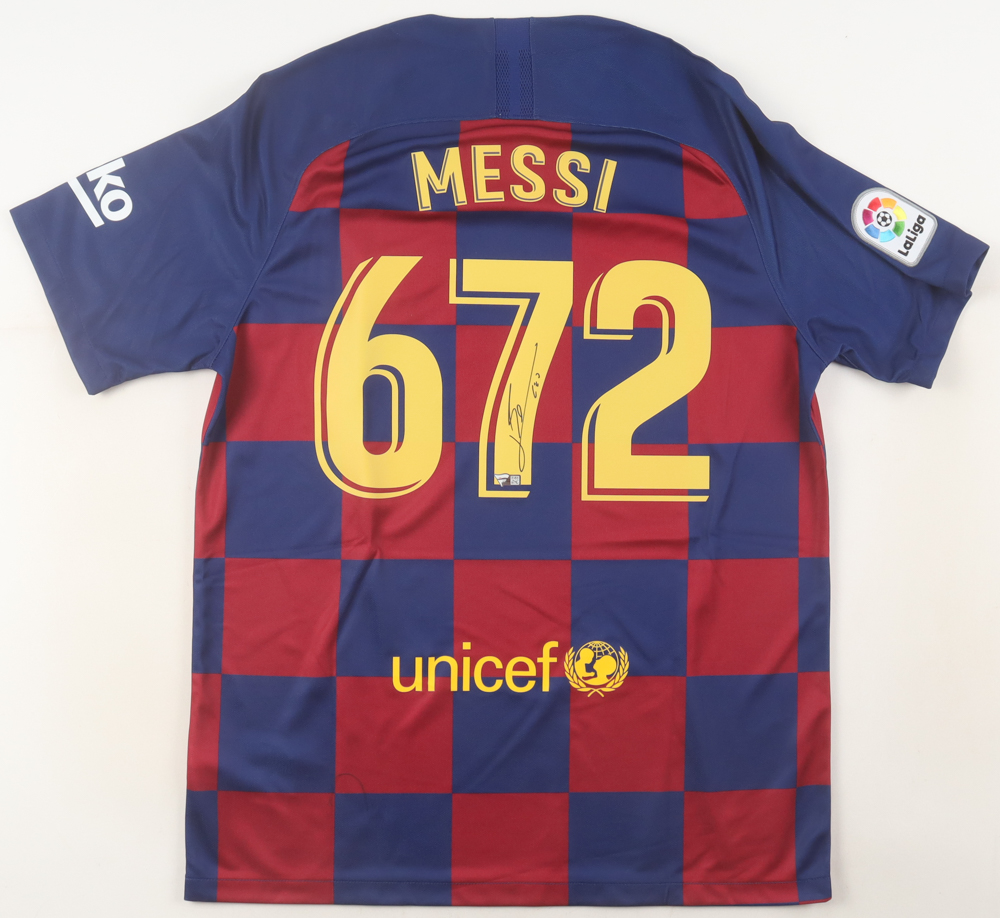 Nike authentic jersey with everything pressed on, size L. Hand-signed and inscribed by Lionel Messi (FC Barcelona).