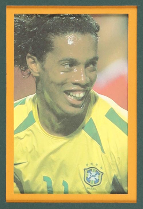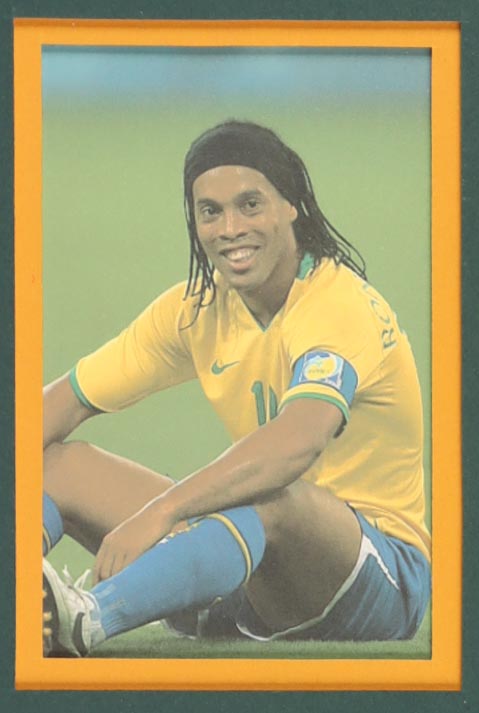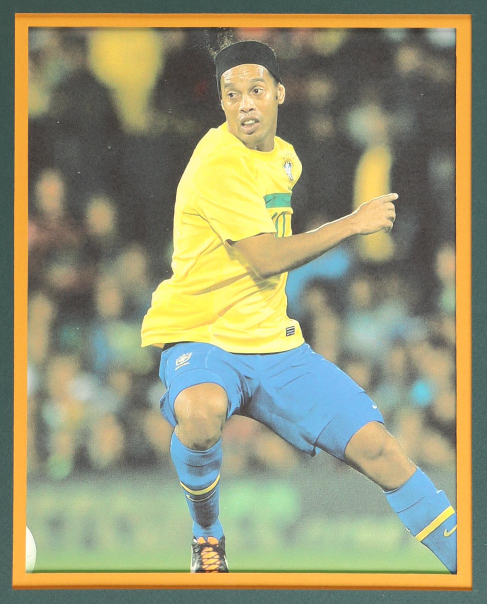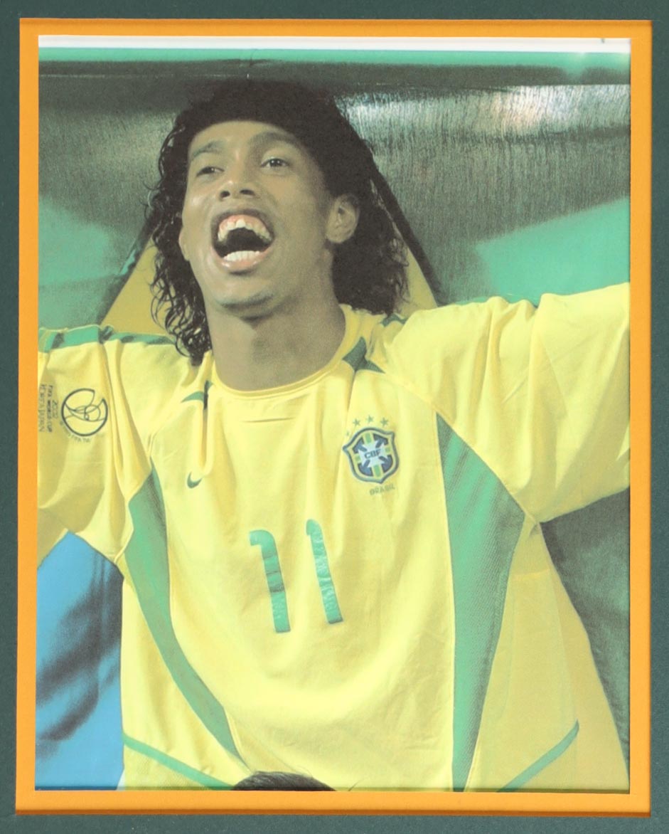 Custom frame measures 34" x 42" in size. Jersey has been hand-signed by Ronaldinho Gaucho (Team Brazil). Display also includes (4) unsigned 8" x 10" photographs and a team patch.