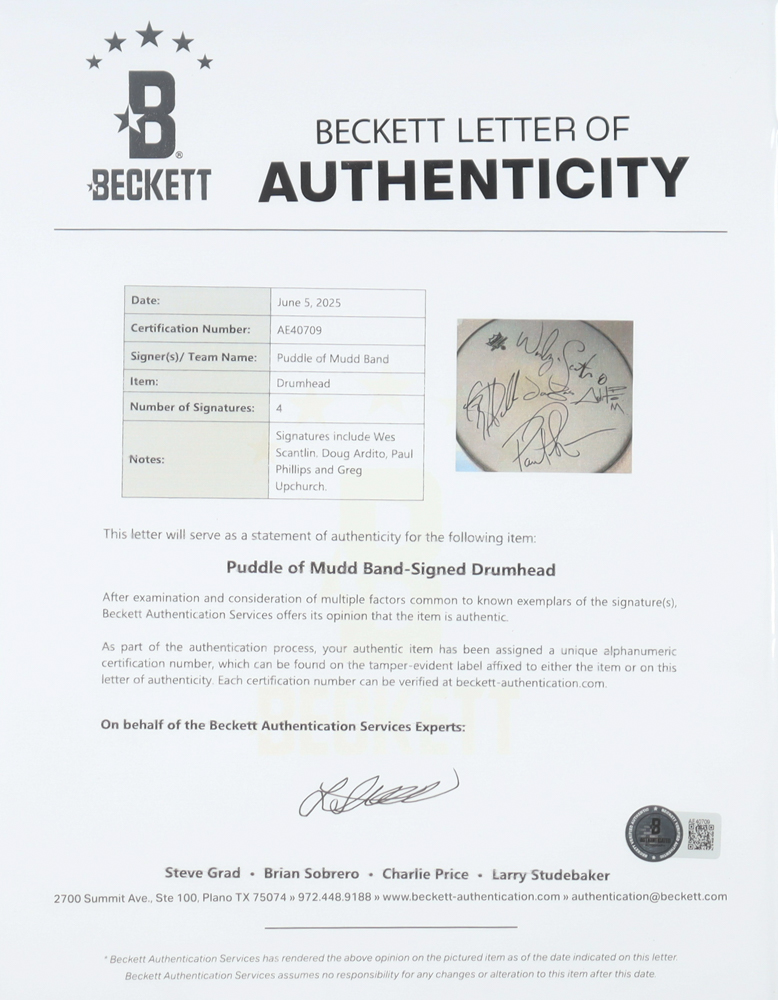 Puddle of Mudd 14.5" Drumhead Band-Signed by Wes Scantlin, Doug Ardito, Paul Phillips & Greg Upchurch (Beckett)