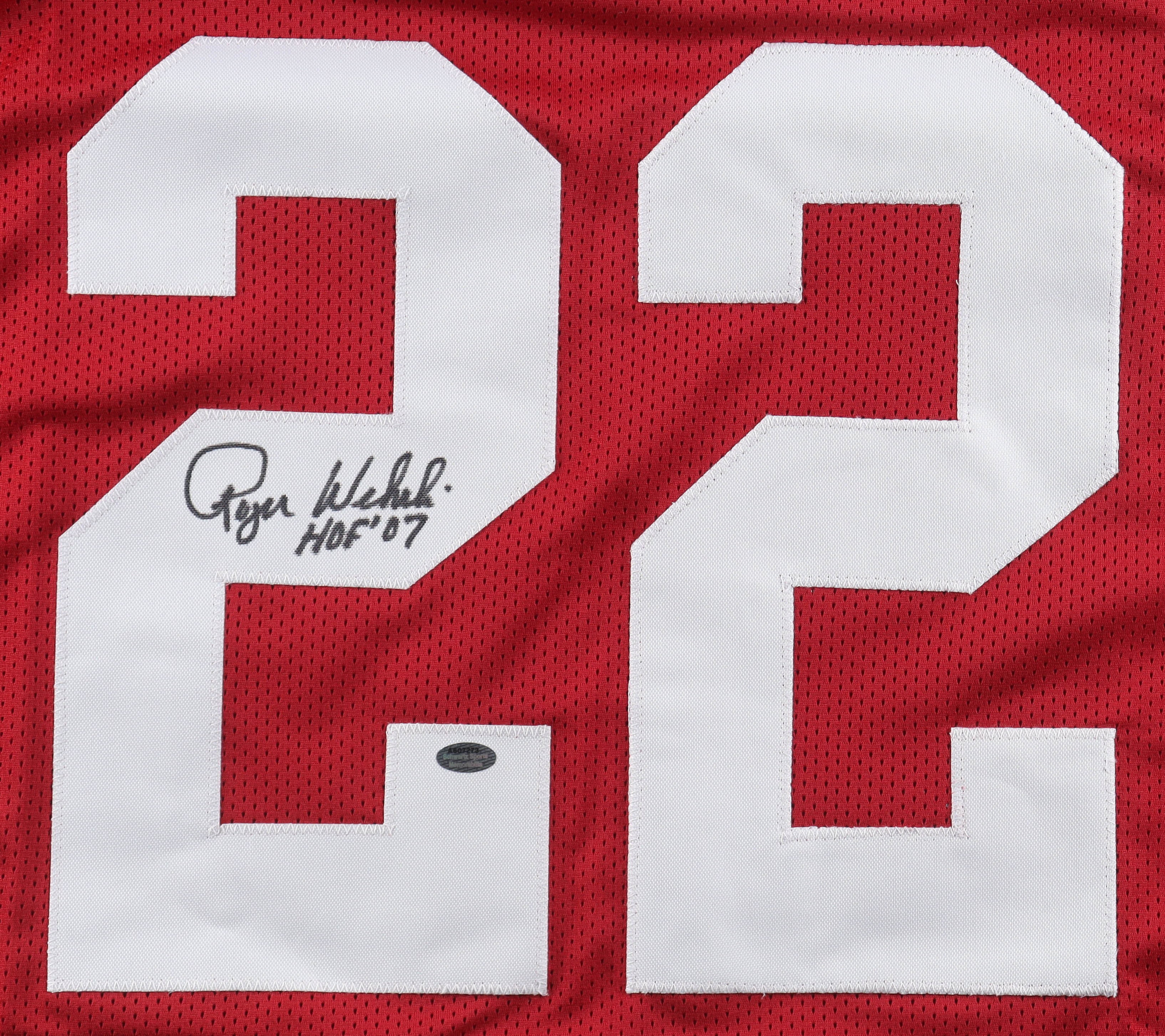 Custom jersey with everything sewn on, size XL. Hand-signed and inscribed by Roger Wehrli (HOF). Please note, the signature and inscription have bled.