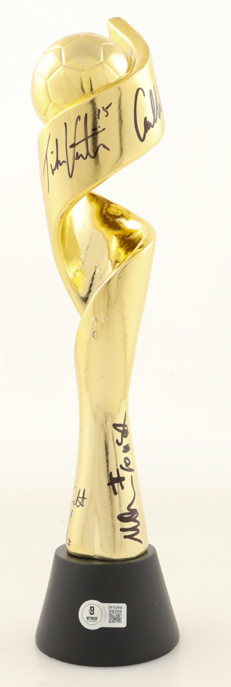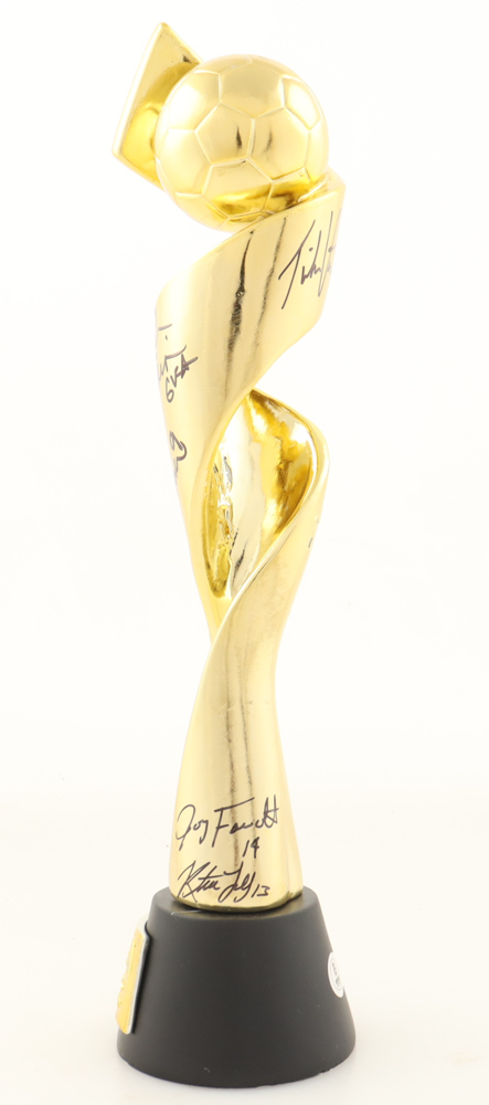 Replica trophy measures approximately 12" tall. Hand-signed by Brandi Chastain, Briana Scurry, Joy Fawcett, Kristine Lilly, Michelle Akers, Carla Overbeck, Tisha Venturini and Mia Hamm.