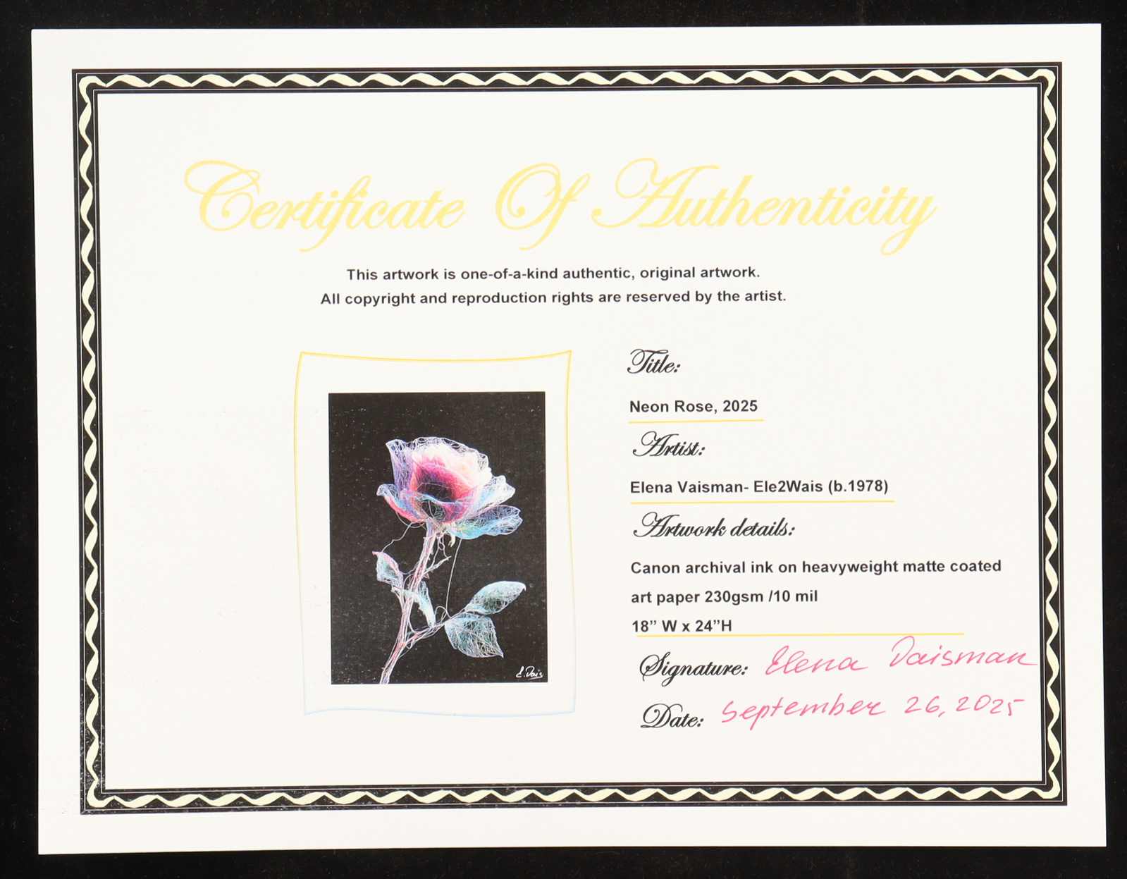 Original canon archival ink on heavyweight matte coated art paper 230 gsm / 10mil measures 18" x 24" in size. Hand-signed by the artist Elena Vaisman (Ele2Wais).