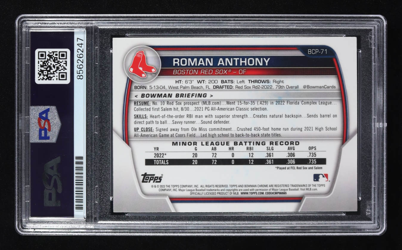 Roman Anthony Signed 2023 Bowman Chrome Prospects #BCP71 RC (PSA | Auto Grade PSA Authentic)